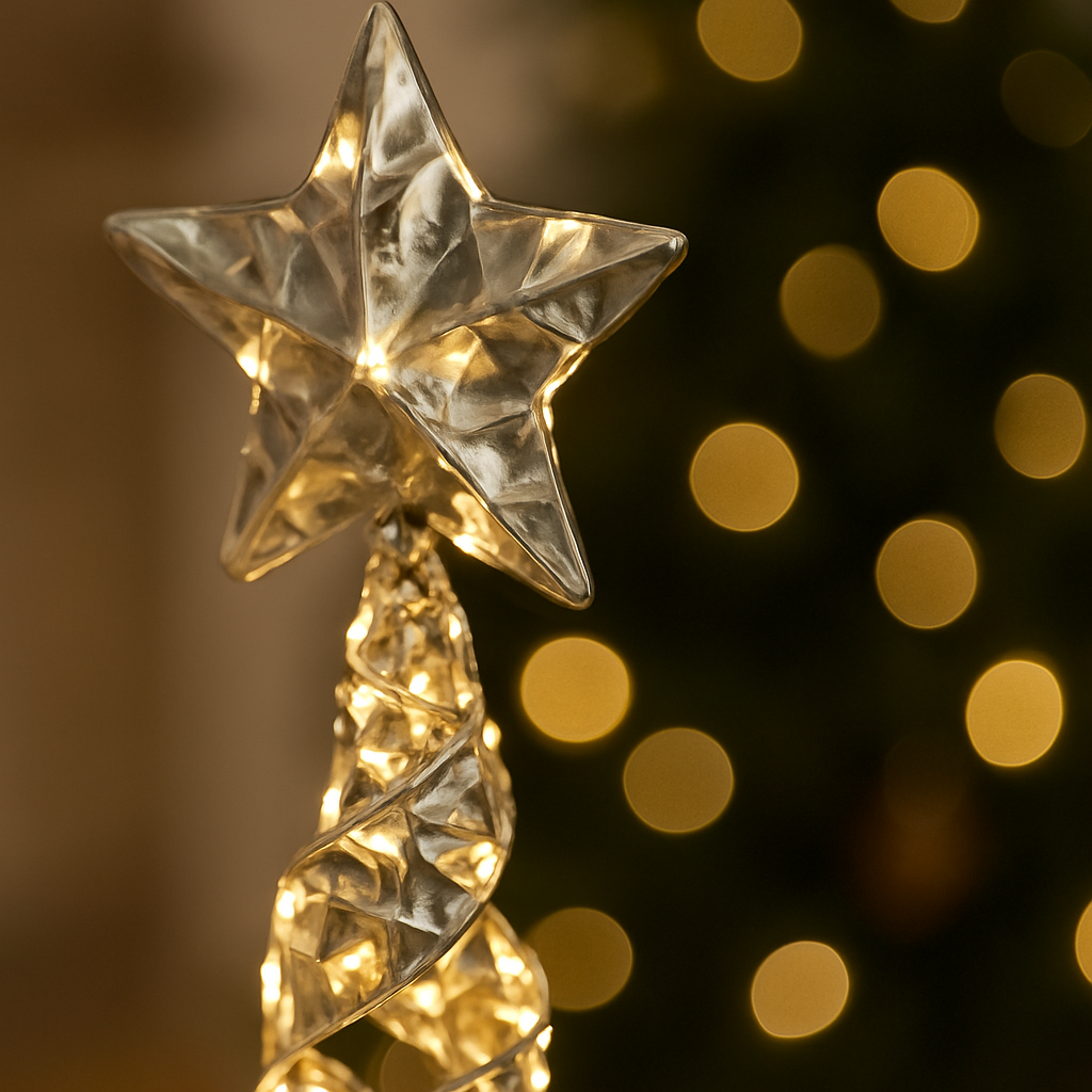 Questo elegante albero decorativo è una raffinata scultura luminosa a forma conica, realizzata con una struttura intrecciata di elementi trasparenti che creano un effetto simile a piccole gemme o foglie sovrapposte.