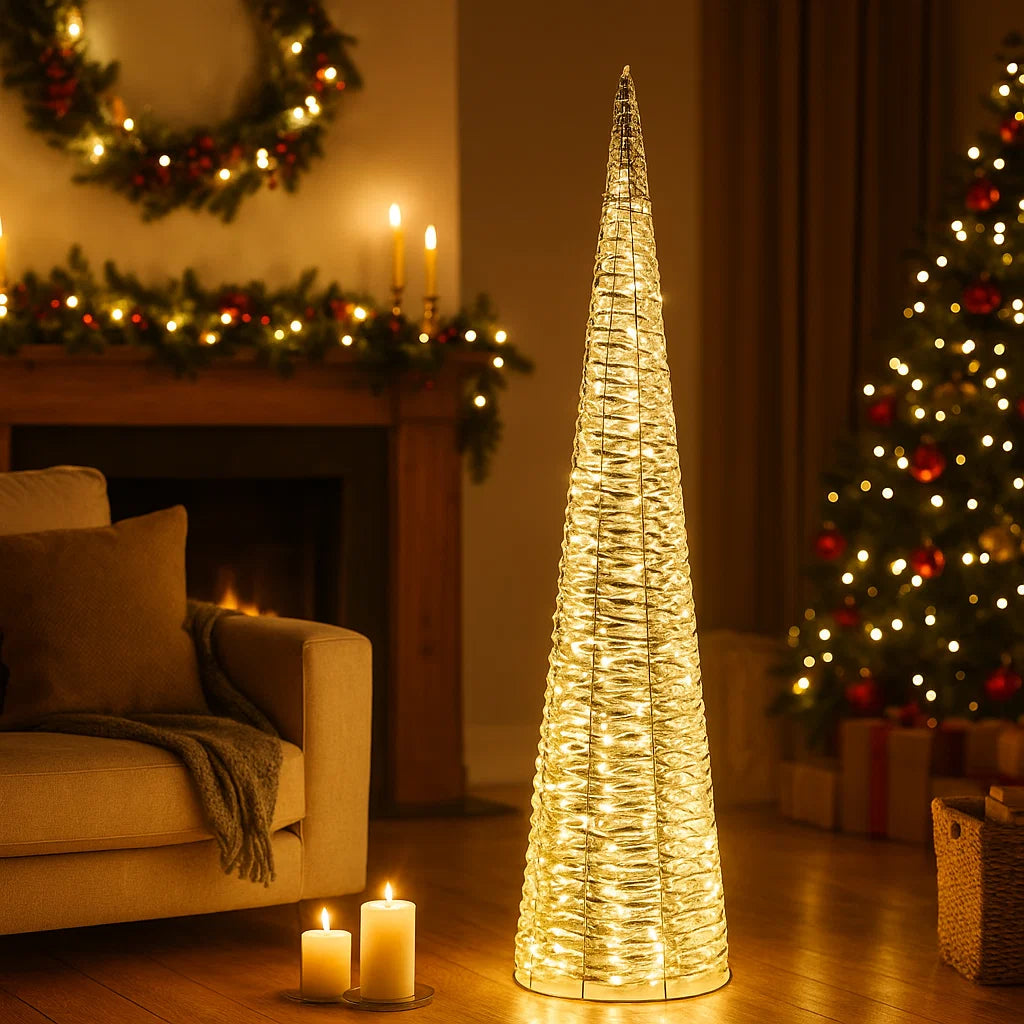 Questo elegante albero decorativo è una raffinata scultura luminosa a forma conica, realizzata con una struttura intrecciata di elementi trasparenti che creano un effetto simile a piccole gemme o foglie sovrapposte.