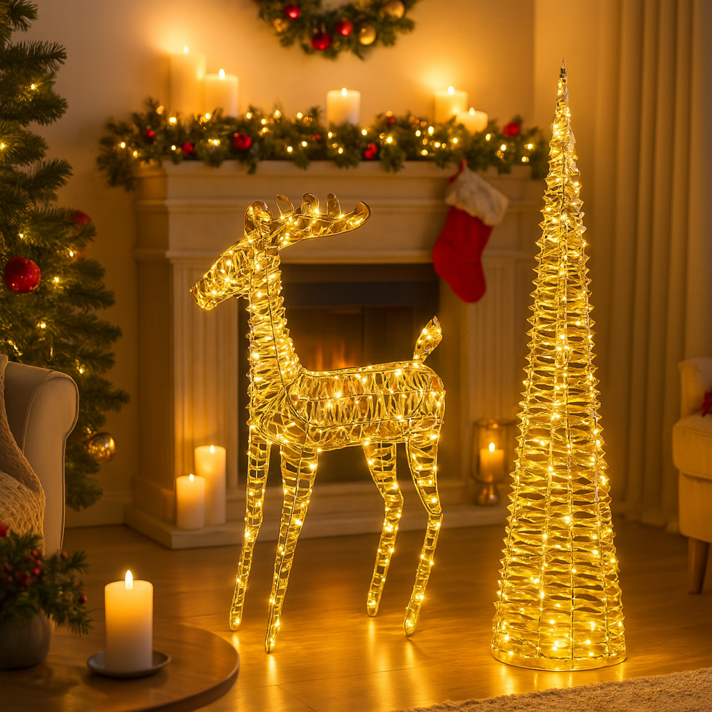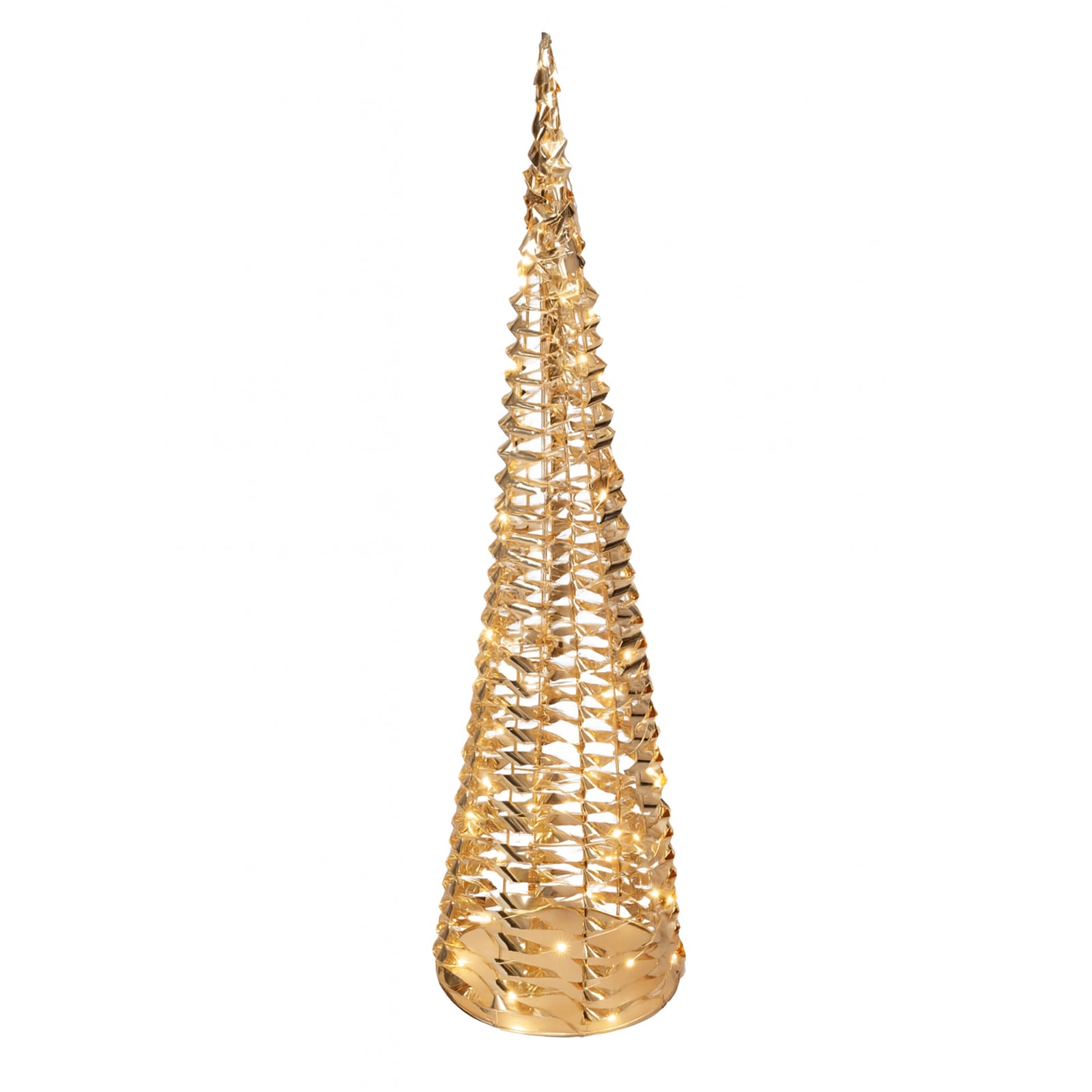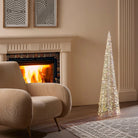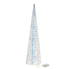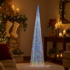 L'albero di Natale a forma di cono in metallo color iridescente con luci LED è una decorazione festiva di grande impatto visivo, pensata per aggiungere un tocco di eleganza e modernità agli ambienti natalizi.