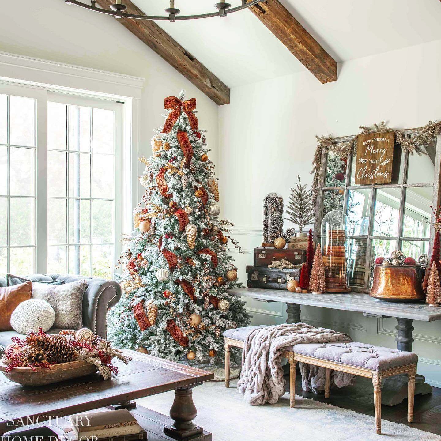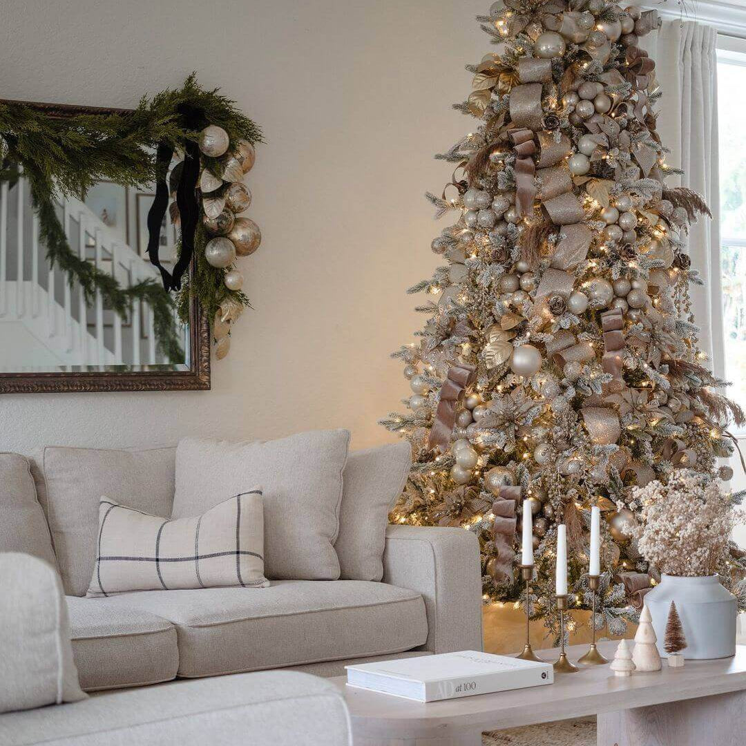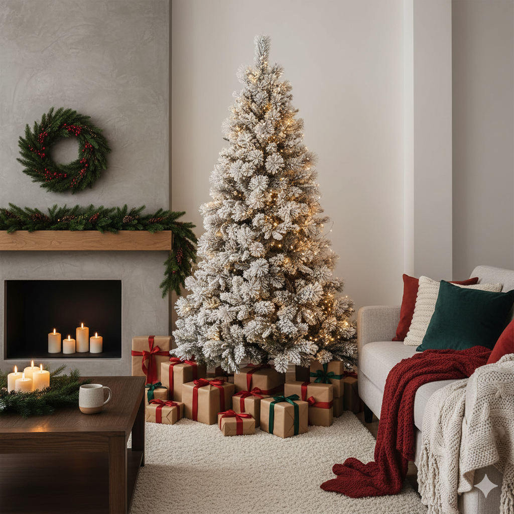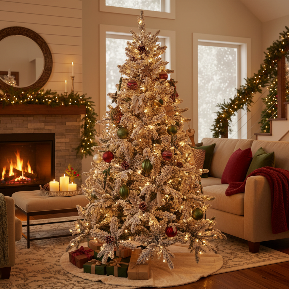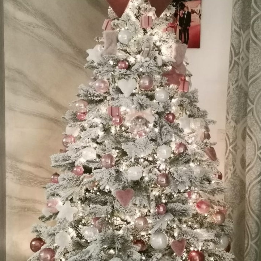 Questo albero unisce la bellezza del PE Real Touch con la solidità dei PP Aghi di Pino e la magia del Flock.