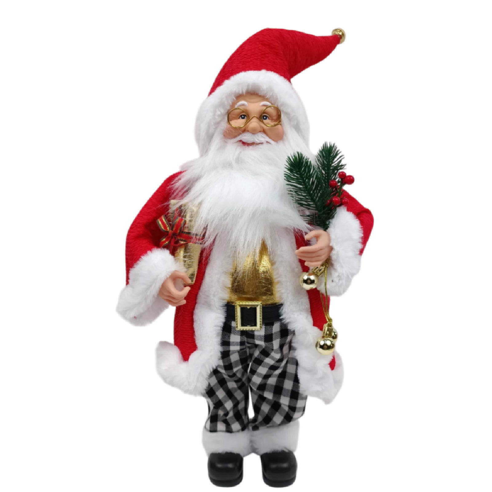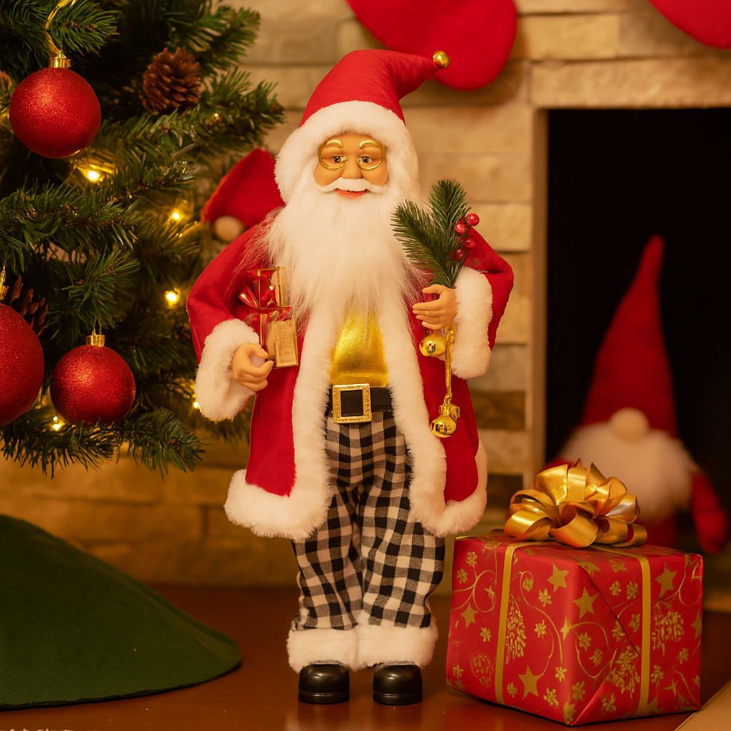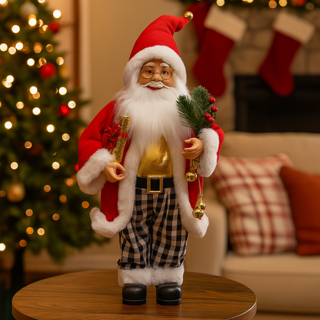 Il viso di Babbo Natale è modellato con cura, esprimendo un'espressione calorosa e accogliente che evoca lo spirito delle festività.