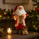 Nelle mani imbottite, Babbo Natale regge un sacco di regali in tessuto, arricchito da nastri colorati e piccoli pacchetti cuciti a mano, simbolo di generosità e sorpresa.