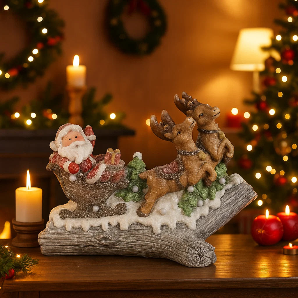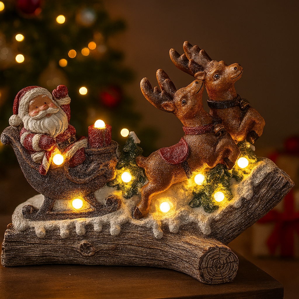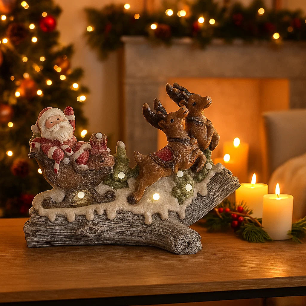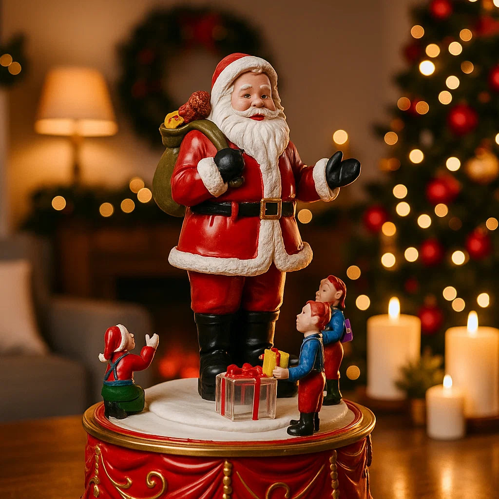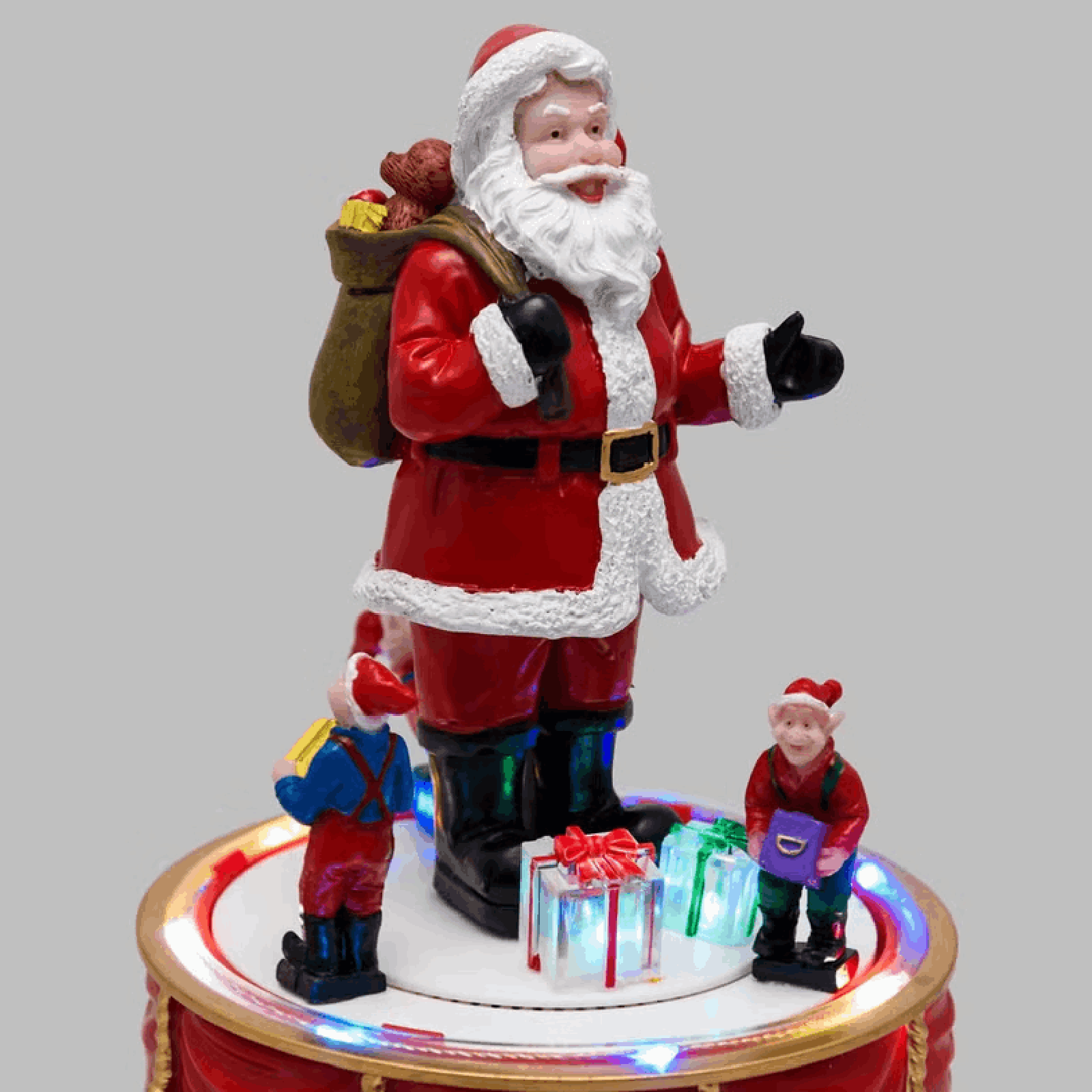 Questo piccolo Villaggio di Natale raffigura un Babbo Natale che si erge su un piedistallo luminoso allestito con un drappo rosso e oro. Sopra questa base ruotano tre piccoli Elfi intenti a gesticolare con dei pacchi regalo. Il bordo del piedistallo è circondato da LED RGB cambiacolore, che illuminano i personaggi creando un'atmosfera festosa.