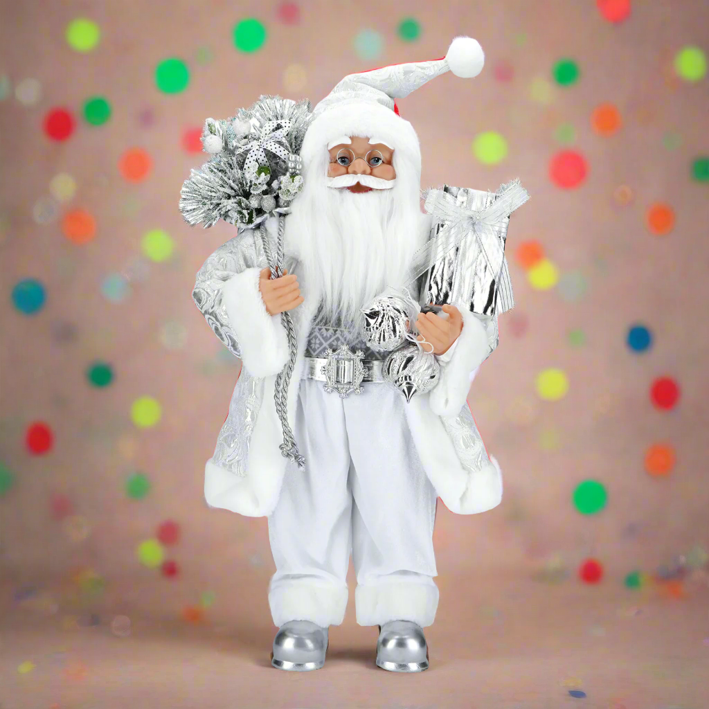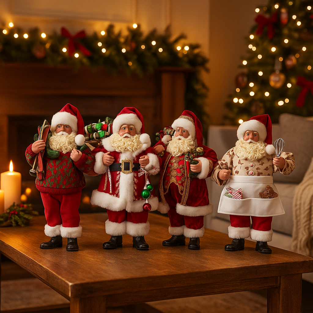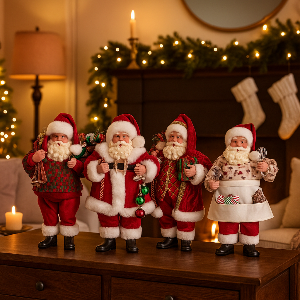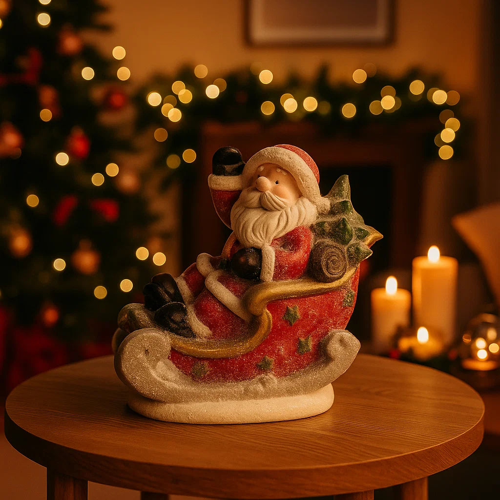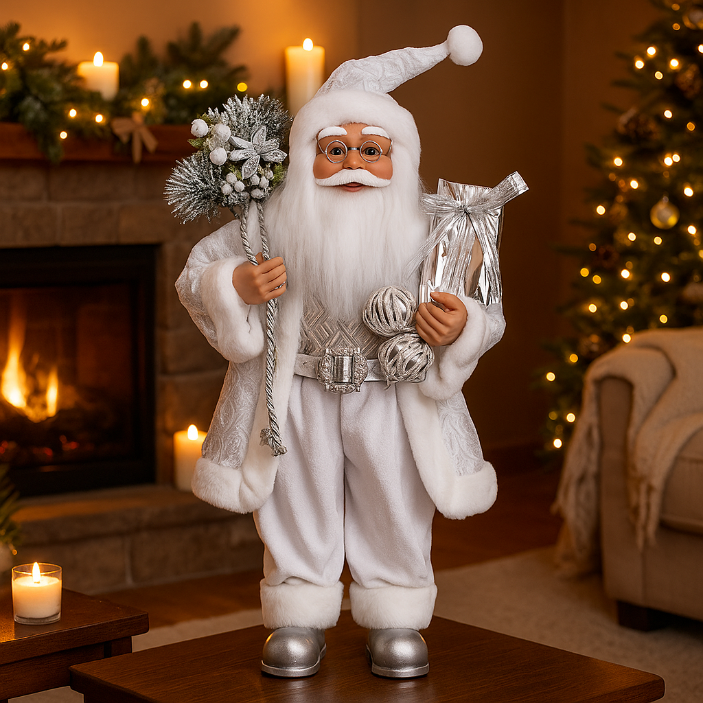 Questo piccolo Villaggio di Natale raffigura un Babbo Natale che si erge su un piedistallo luminoso allestito con un drappo rosso e oro. Sopra questa base ruotano tre piccoli Elfi intenti a gesticolare con dei pacchi regalo. Il bordo del piedistallo è circondato da LED RGB cambiacolore, che illuminano i personaggi creando un'atmosfera festosa.