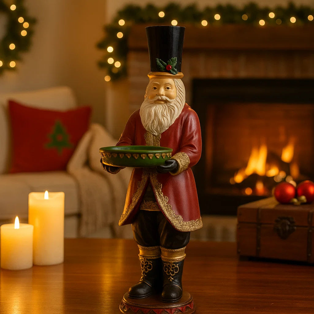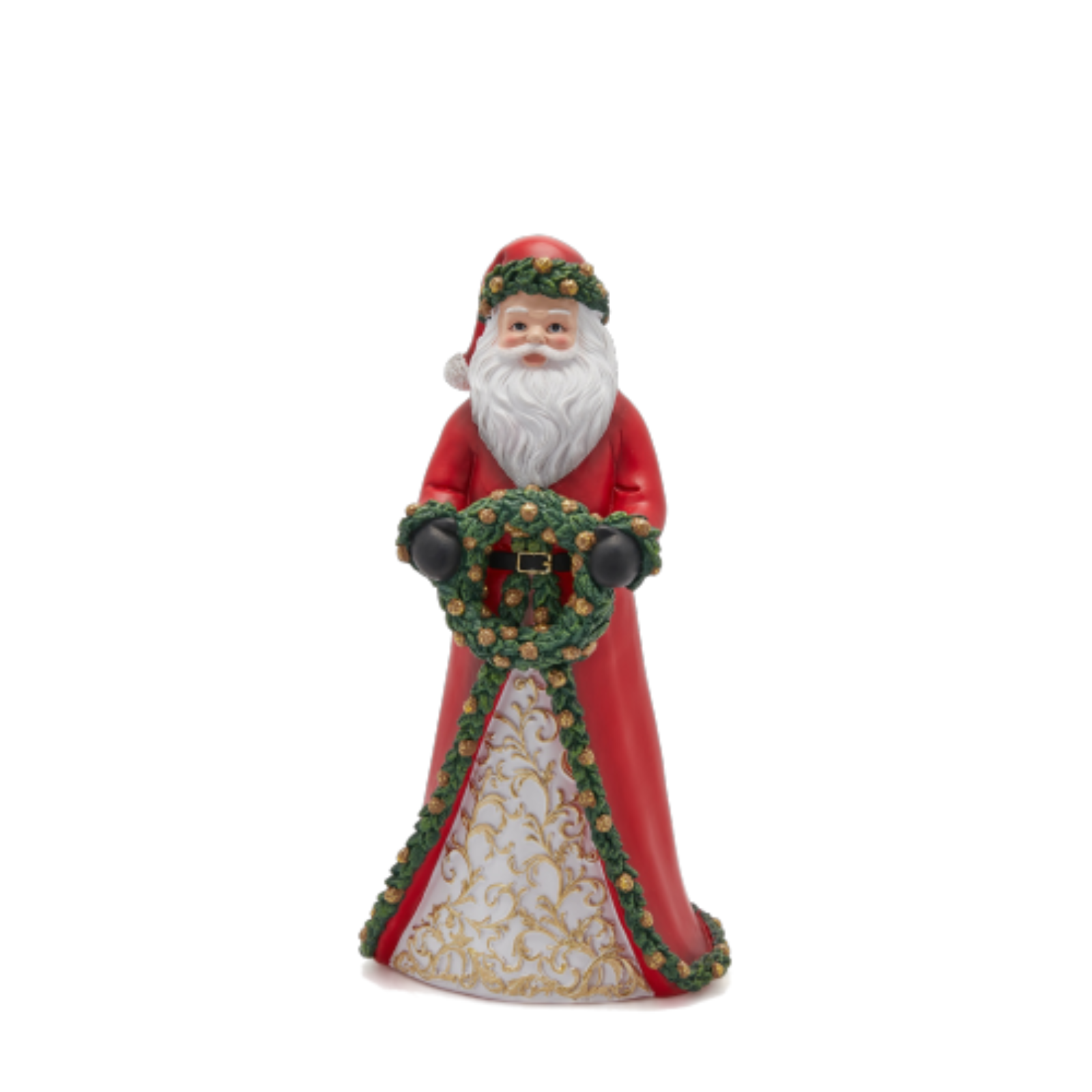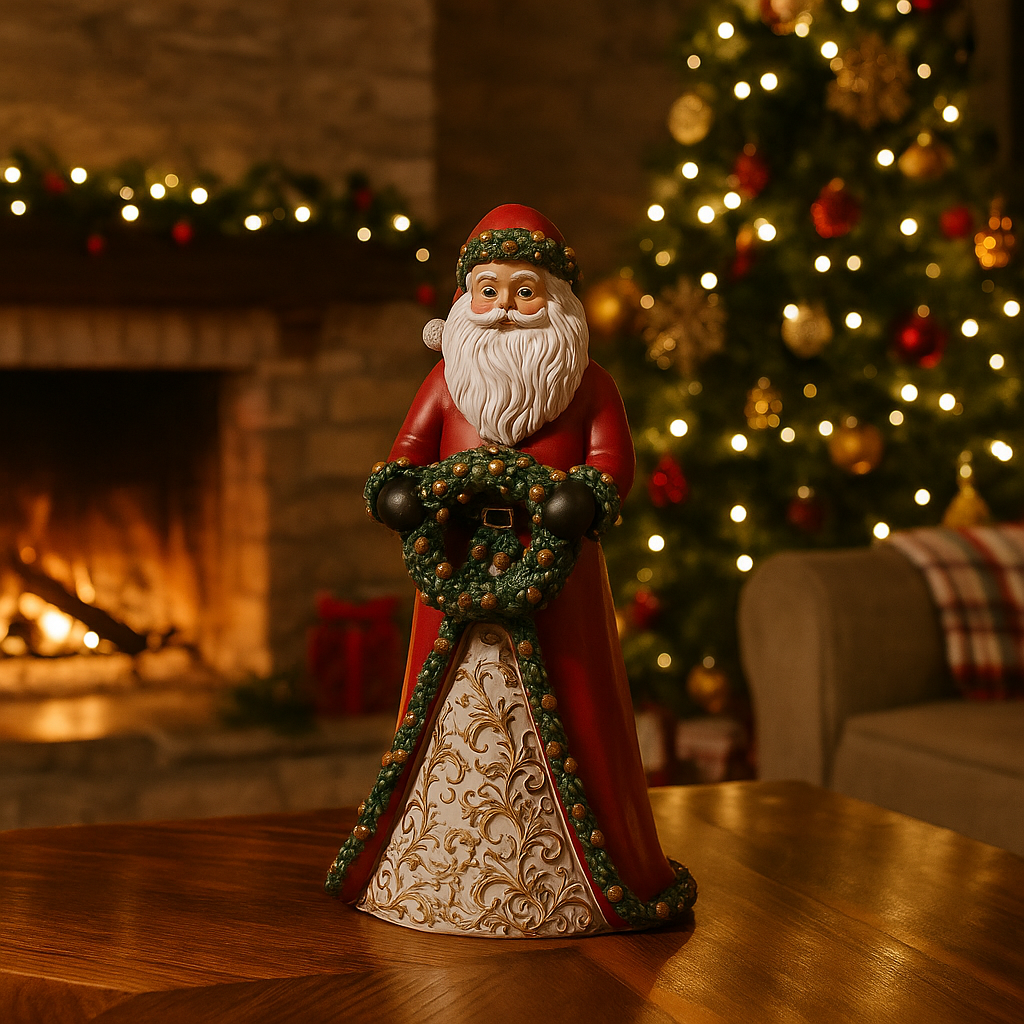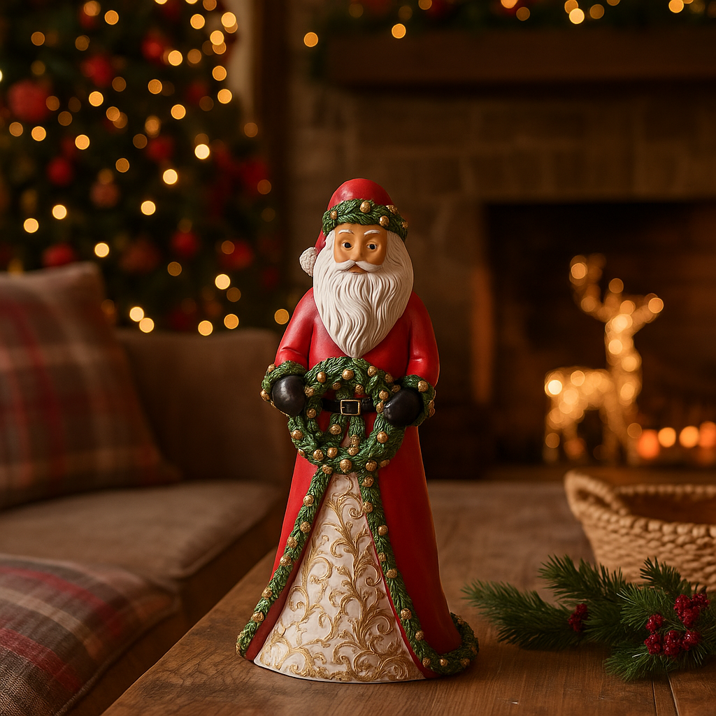 Questa figura decorativa raffigura un Babbo Natale tradizionale, avvolto nel suo classico abito rosso e impreziosito da una ghirlanda festiva tra le mani.