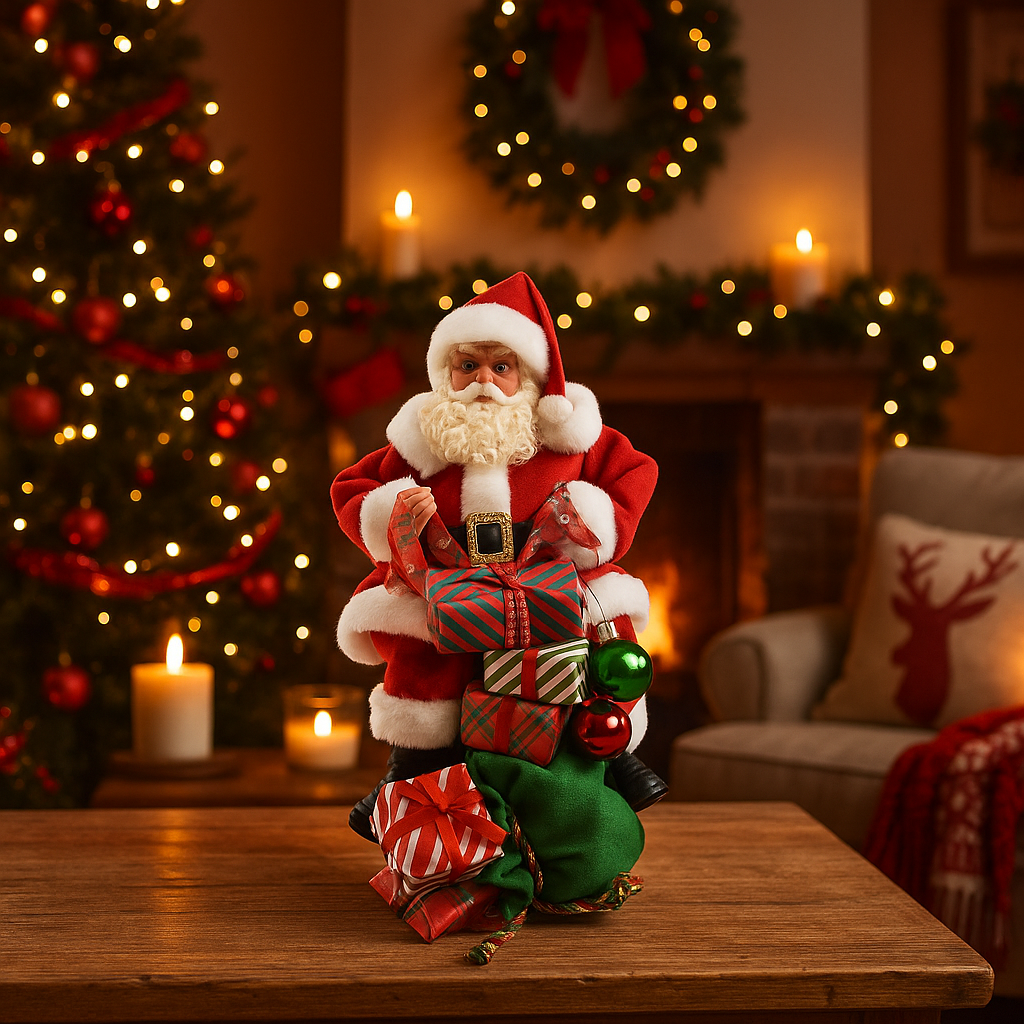 Questa decorazione natalizia raffigura un classico Babbo Natale in miniatura, alto 20 cm, con in spalla un sacco colmo di doni e un regalo in mano, pronto a portare magia e allegria nei tuoi ambienti. Ideale da posizionare su mensole, tavolini, centrotavola o all'interno di vetrine e allestimenti festivi.