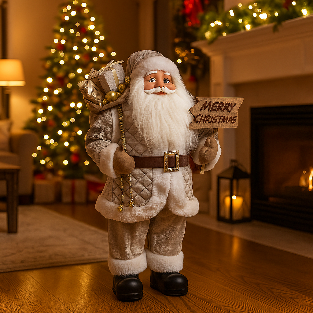 Rendi ancora più magica l’atmosfera del tuo Natale con questo splendido Babbo Natale decorativo, vestito in un raffinato abito color champagne. Con il suo grande sacco colmo di doni, pronto a portare gioia e sorrisi, diventerà il protagonista indiscusso delle tue decorazioni natalizie.