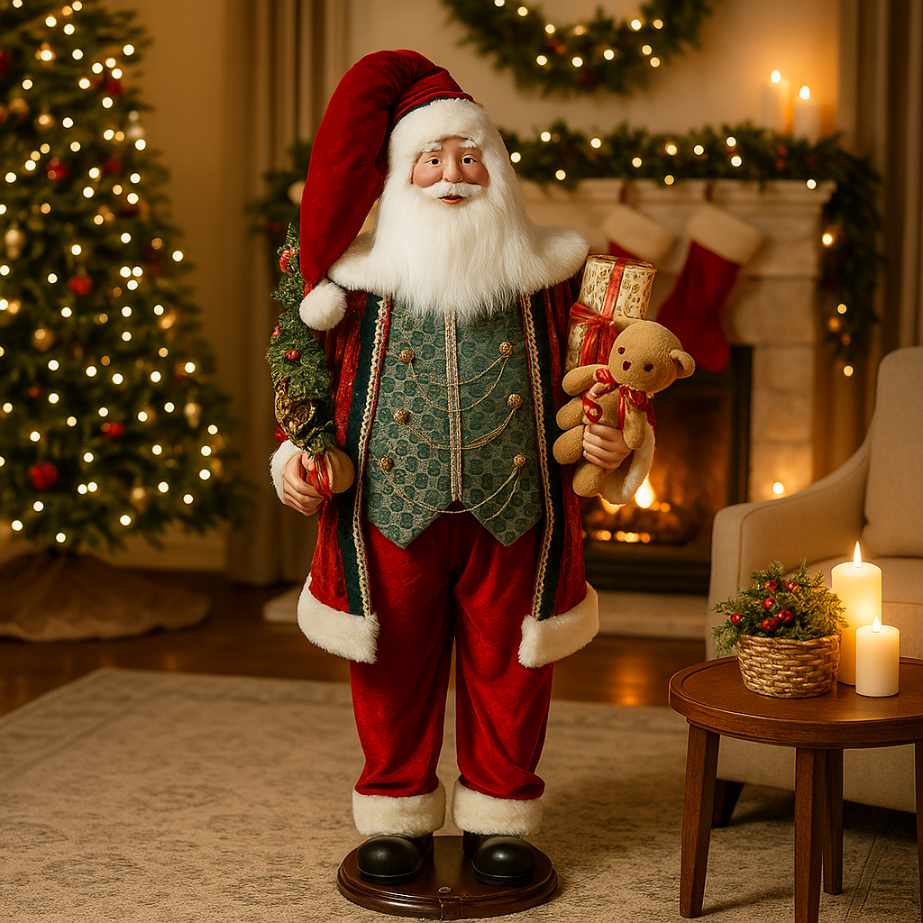 Vestito con l'abito tradizionale rosso, Babbo Natale è arricchito da dettagli come bordature in pelliccia bianca, una cintura nera con fibbia dorata e stivali coordinati.
