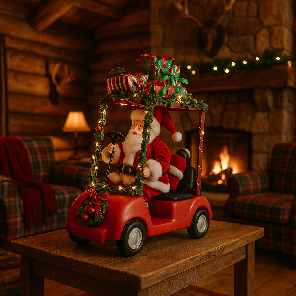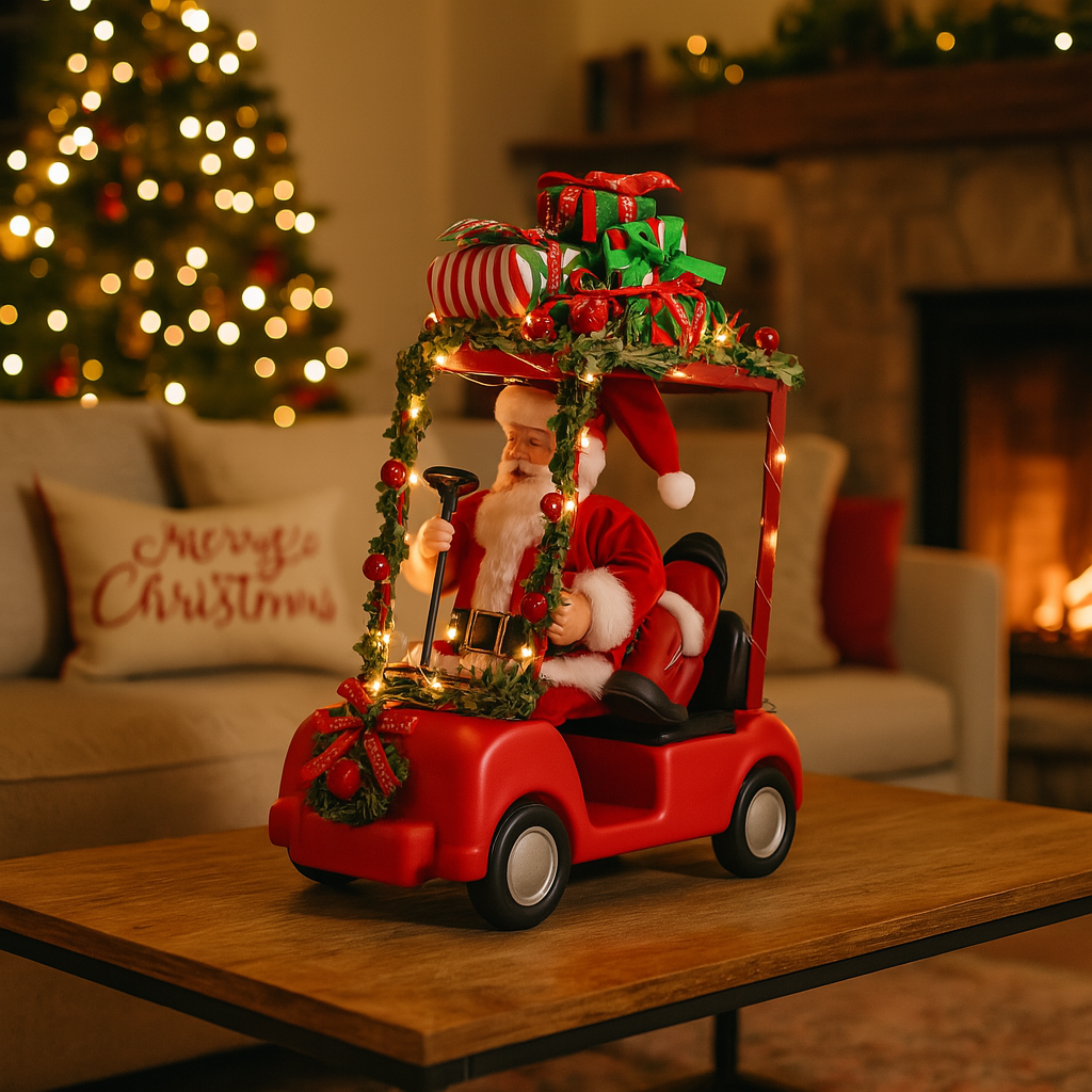 Questa simpatica decorazione raffigurante Babbo Natale alla guida di una macchina da golf è perfetta per aggiungere un tocco divertente e originale alle tue feste.