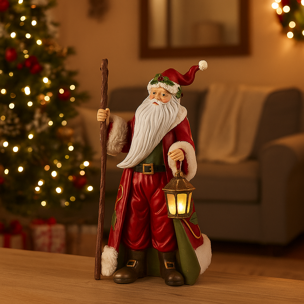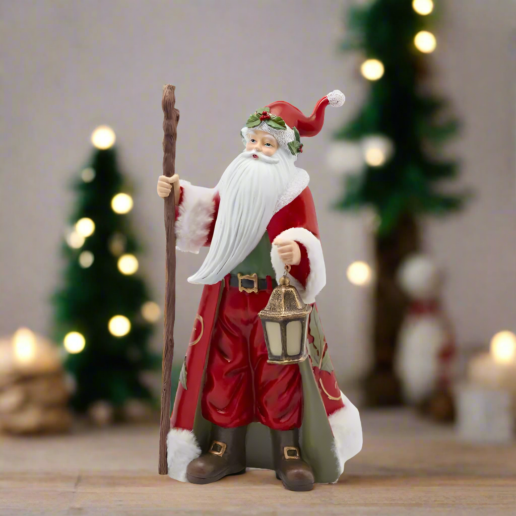 Babbo Natale con bastone statuetta color rosso con led in poliestere da 35 cm