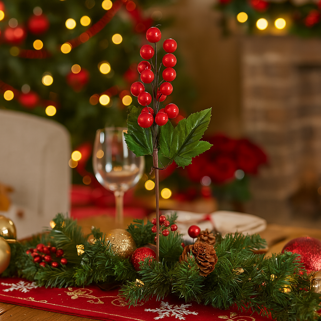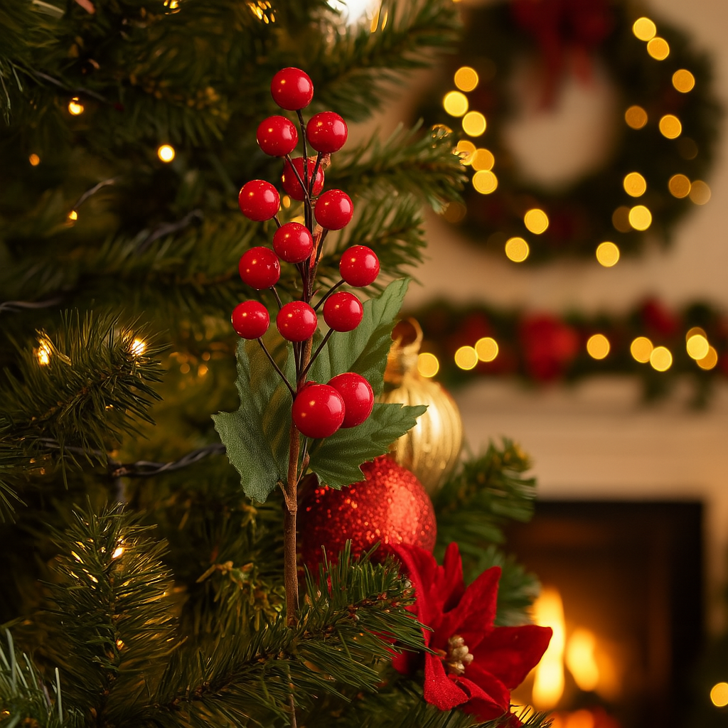 La versatilità di questi grappoli di bacche li rende perfetti non solo per l’albero, ma anche per comporre ghirlande, centrotavola e festività su mensole o camini: il loro impatto cromatico risalta in contrapposizione al verde degli aghi di pino e si abbina armoniosamente a nastri in velluto, pigne naturali o punte di luci calde.