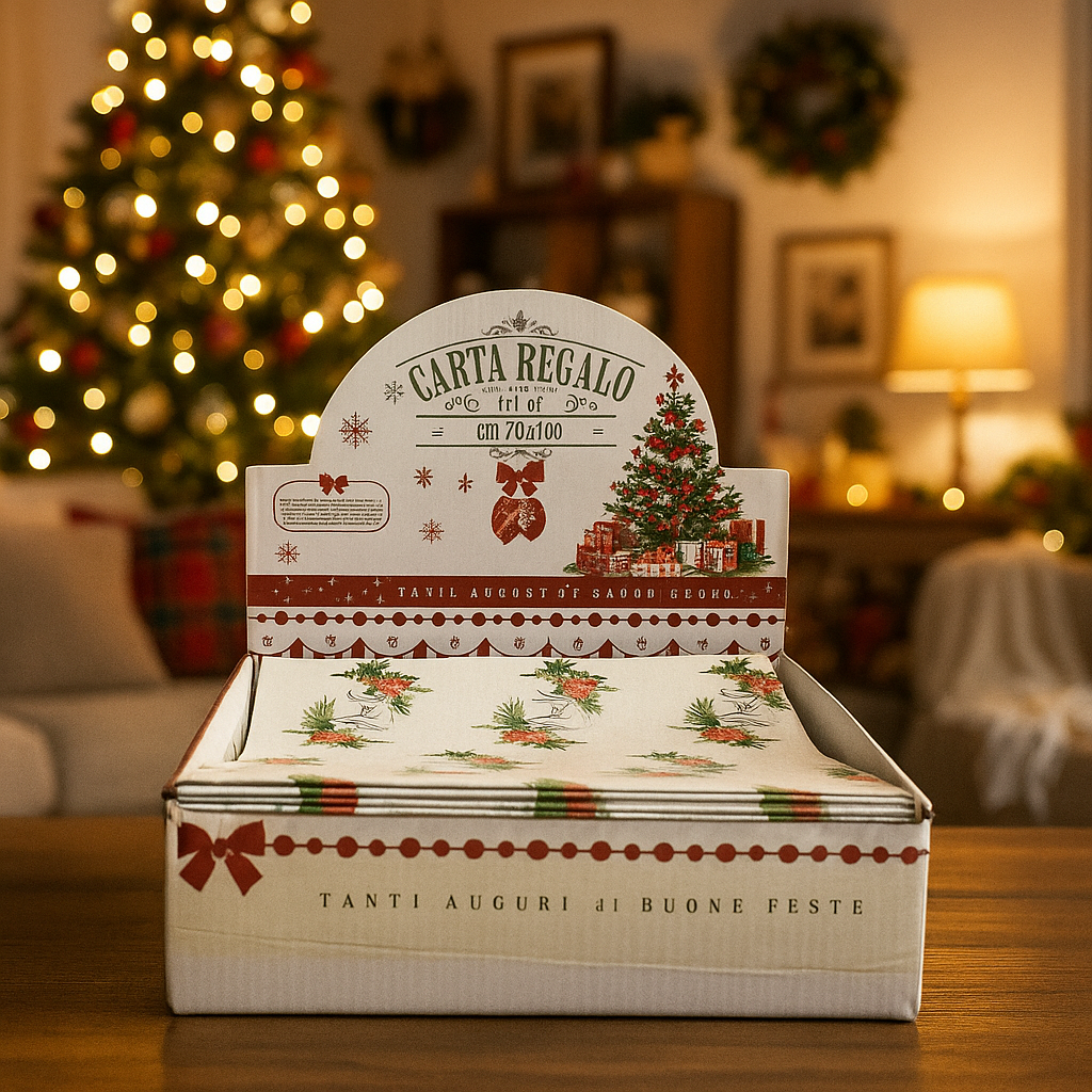 La box con 100 fogli da 70 x 100 cm per carta regalo natalizia è una soluzione completa e versatile pensata per affrontare con praticità ed eleganza tutte le esigenze di confezionamento durante il periodo delle feste.