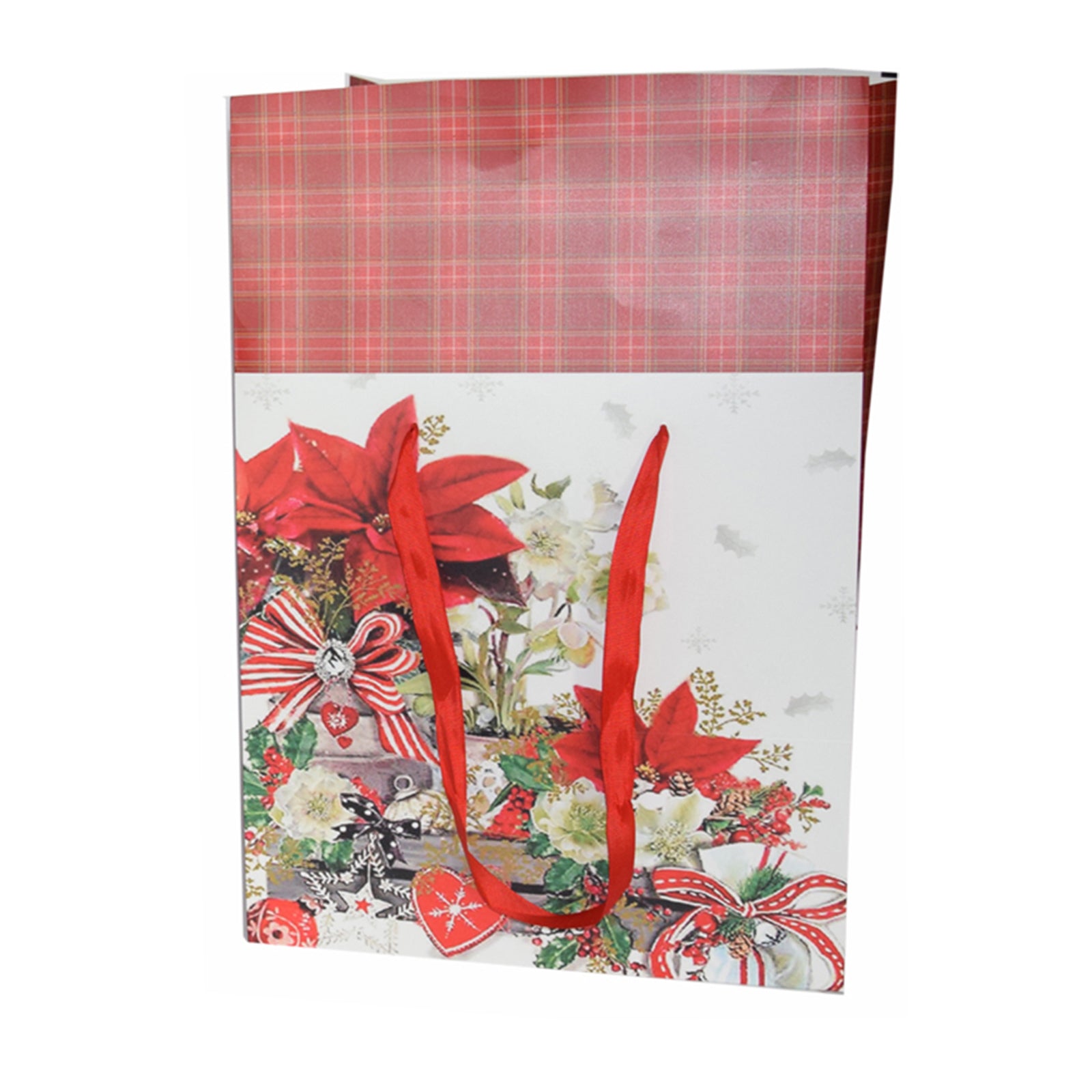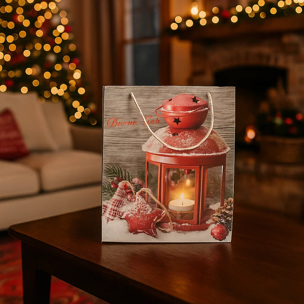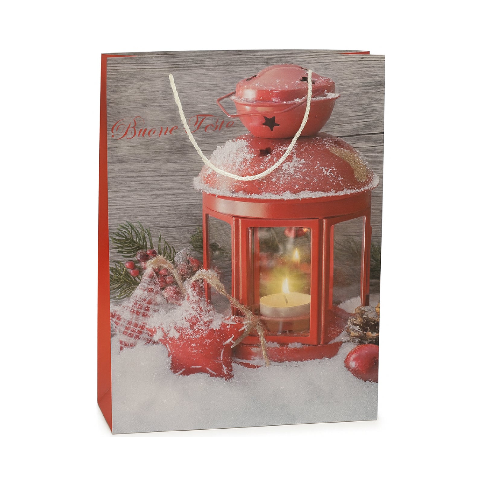 Busta per pacco regalo con disegno lanterna innevata natalizia h 42 cm