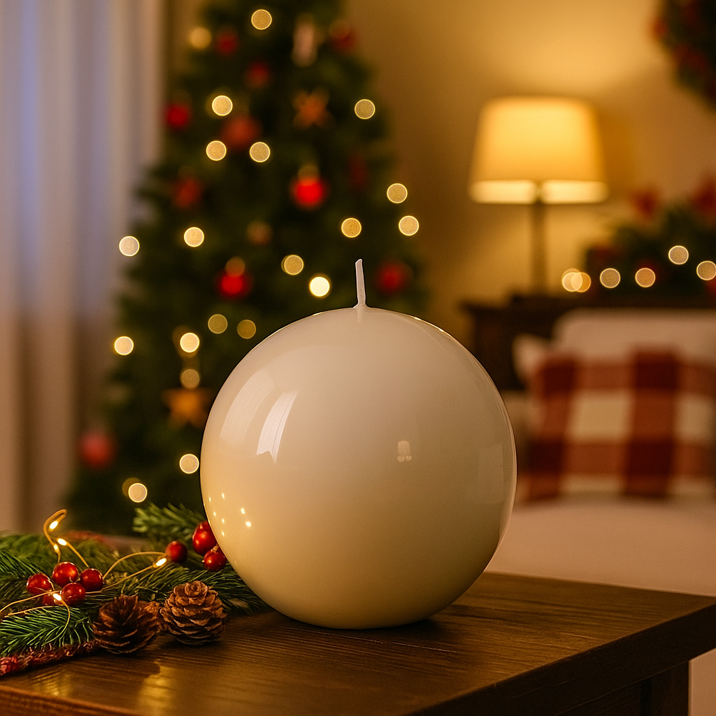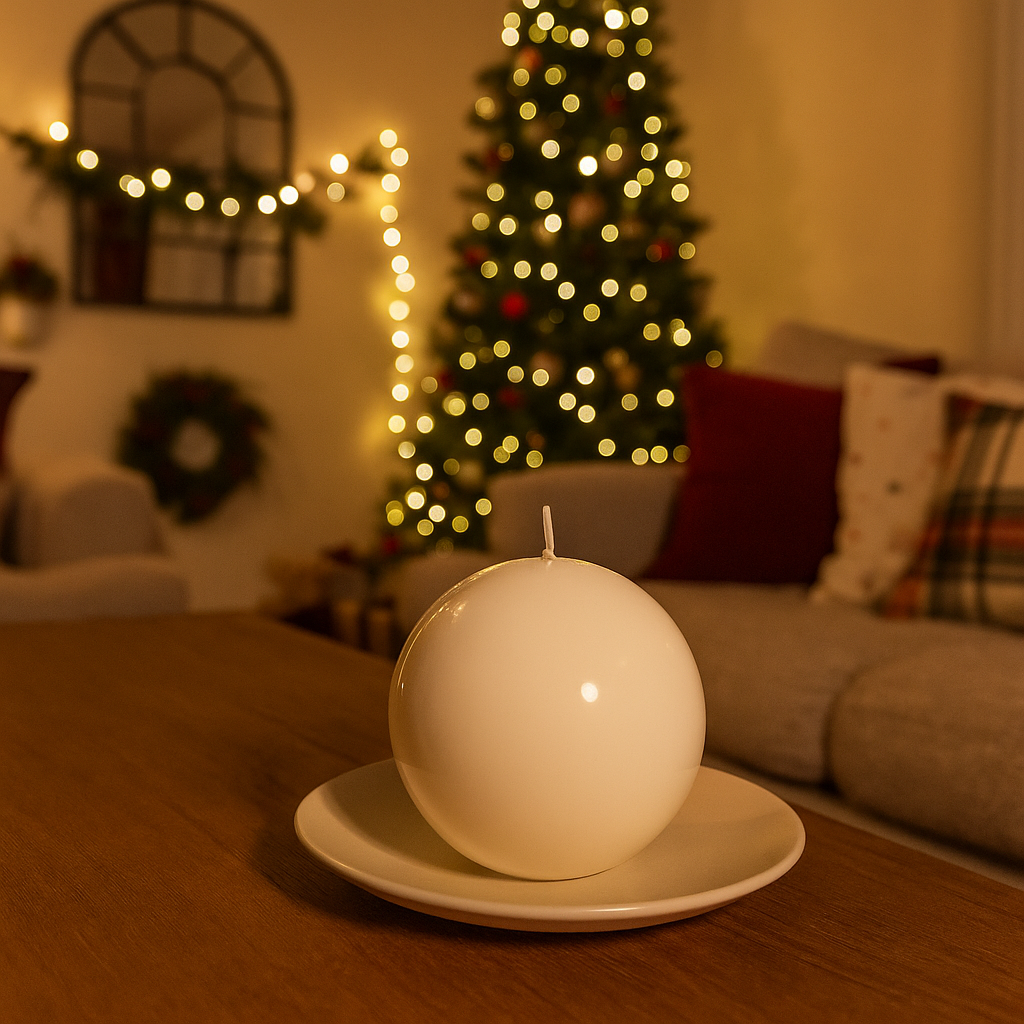 Adorno per Mensole o Tavolini: Posiziona la candela sferica su una mensola o un tavolino come parte di una decorazione più ampia, magari accostandola ad altre decorazioni natalizie come piccoli alberelli o statuine.