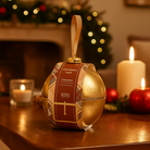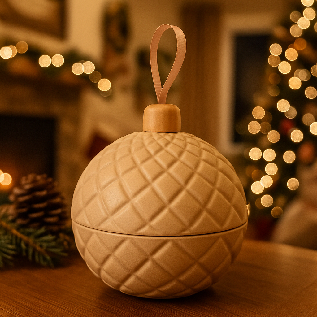 Centro Tavola Festivo: Posiziona la candela sferica su un vassoio decorativo o un piatto natalizio e circondala con pigne dorate, bacche rosse e rametti di abete per un centrotavola accogliente e raffinato.