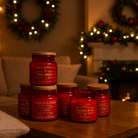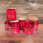 Candela in barattolo con tappo in legno, da 500 grammi, color rosso e scritte oro