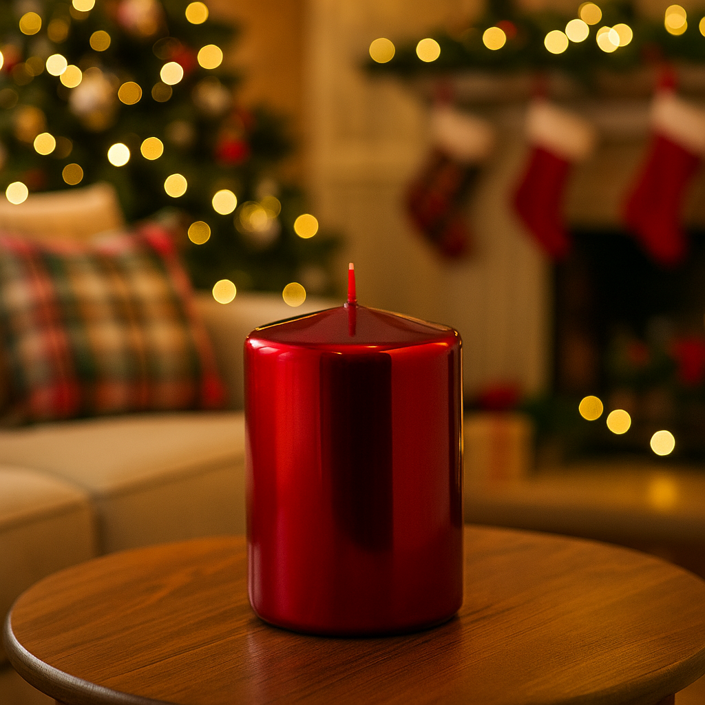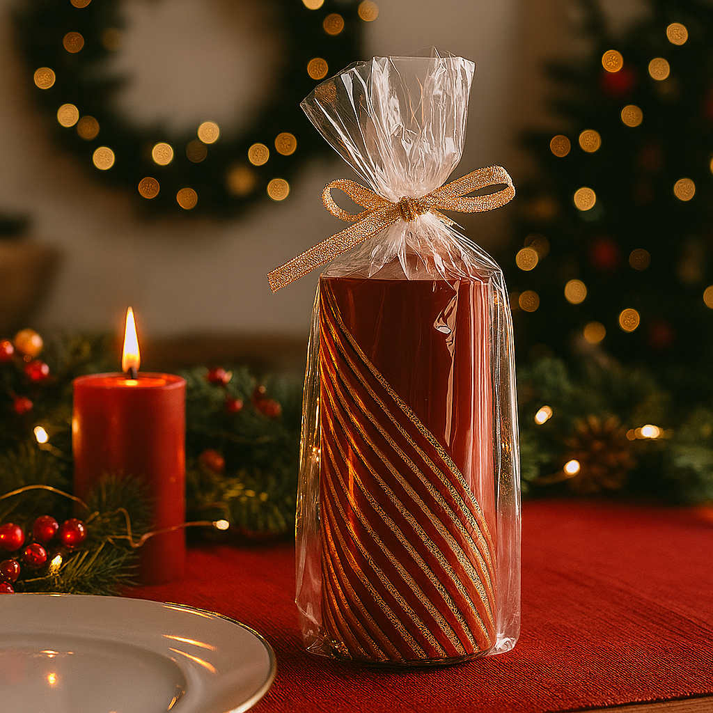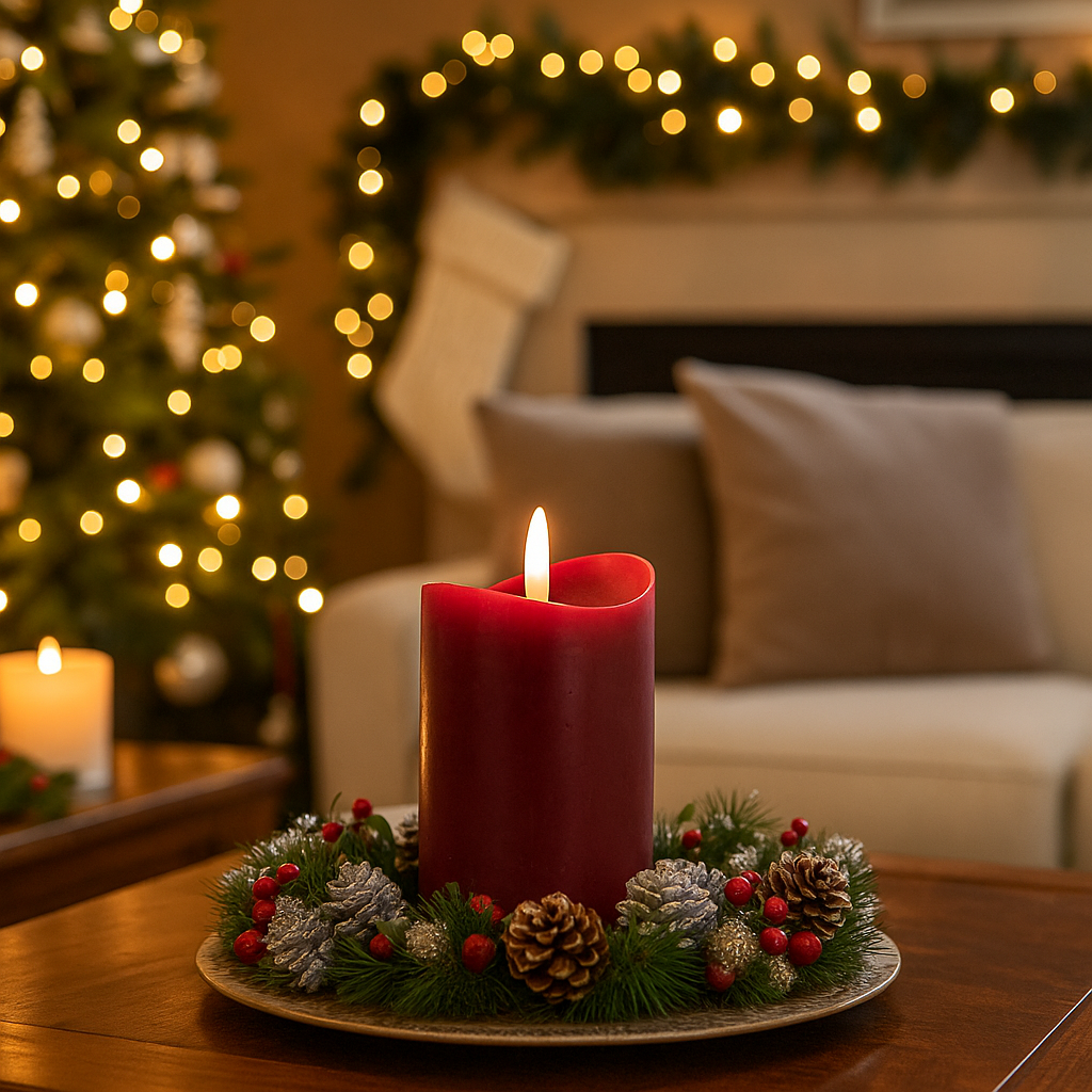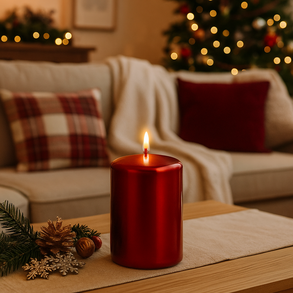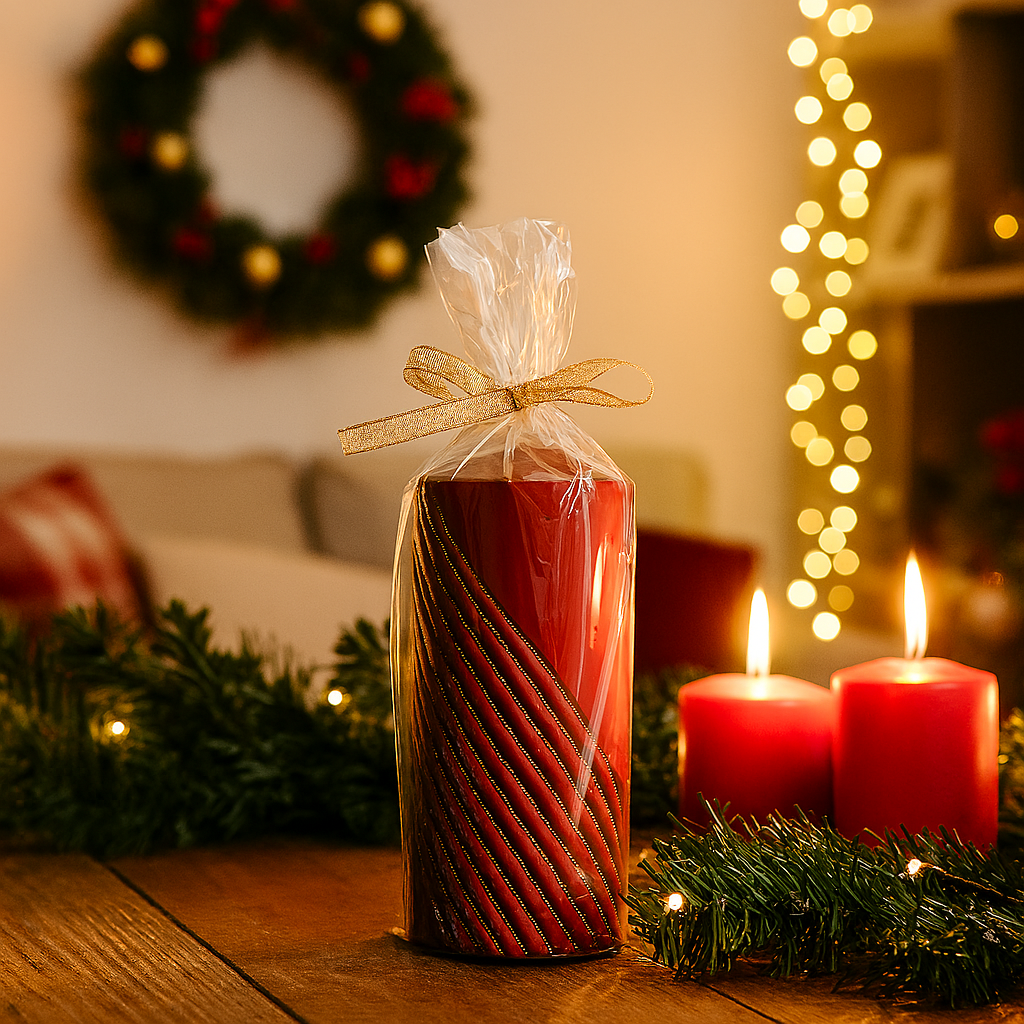 All’accensione, la fusione lenta e uniforme della superficie cerosa valorizza le emozioni natalizie, mentre la calda luce tremolante si riflette nelle pareti di vetro, amplificando la sensazione di intimità e raccoglimento.