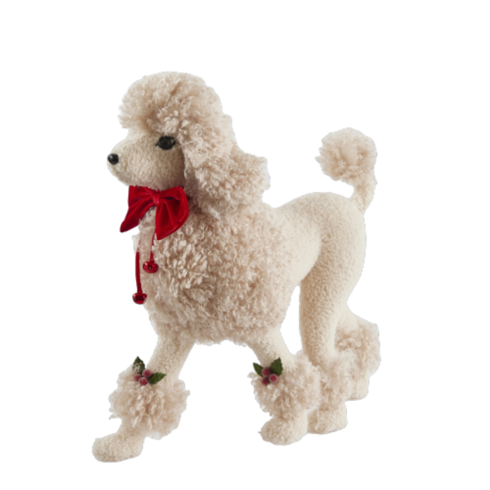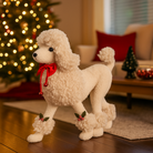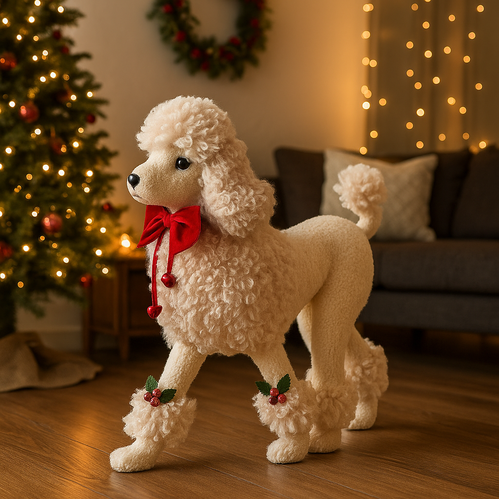 Un barboncino marroncino dall’aspetto sorprendentemente realistico, impreziosito da un elegante fiocco rosso: un dettaglio scenografico perfetto per dare calore e personalità alle decorazioni natalizie (e non solo). Le proporzioni importanti e la cura dei particolari — dal manto riccio effetto pelo allo sguardo espressivo — lo rendono un protagonista immediato di ingressi, salotti, vetrine e allestimenti a tema.
