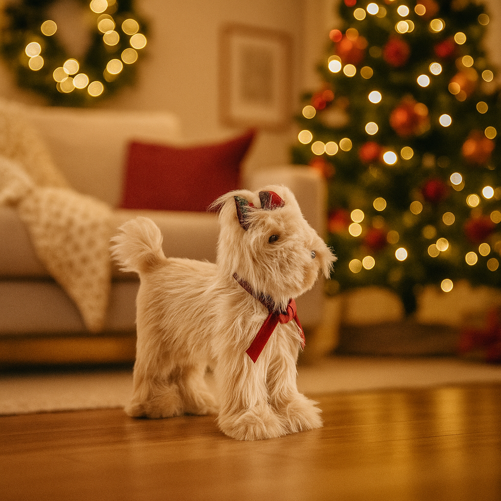 Questo dolcissimo maltese dall’aspetto estremamente realistico, con manto bianco candido e fiocco rosso decorativo, è la scelta perfetta per aggiungere un tocco tenero e scenografico alle tue decorazioni natalizie (e non solo). Grazie ai dettagli curati del muso e all’effetto pelo morbido, diventa subito un protagonista discreto ma irresistibile di ingressi, salotti, vetrine o allestimenti a tema.