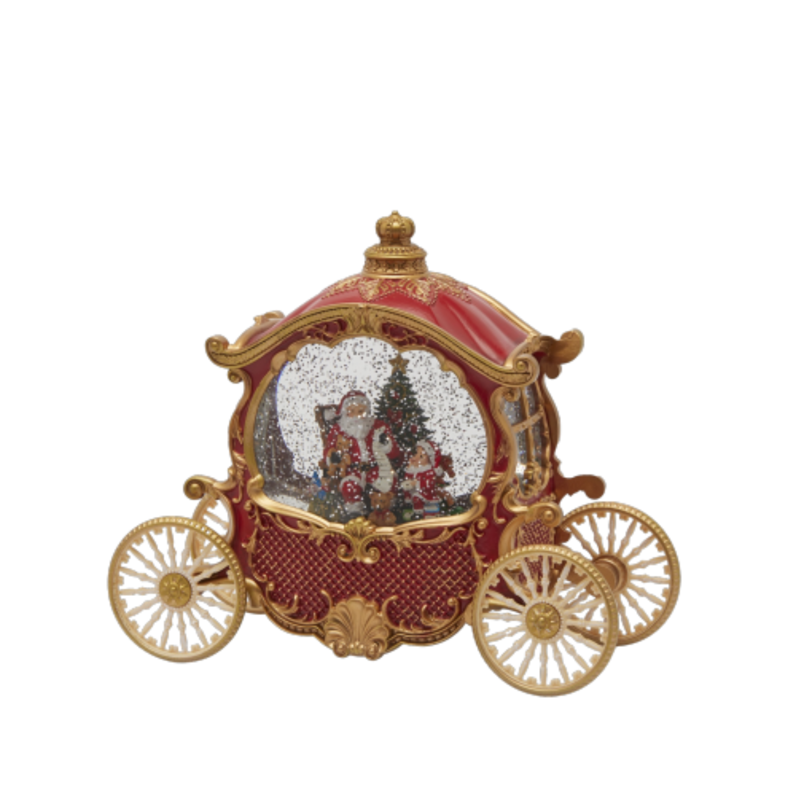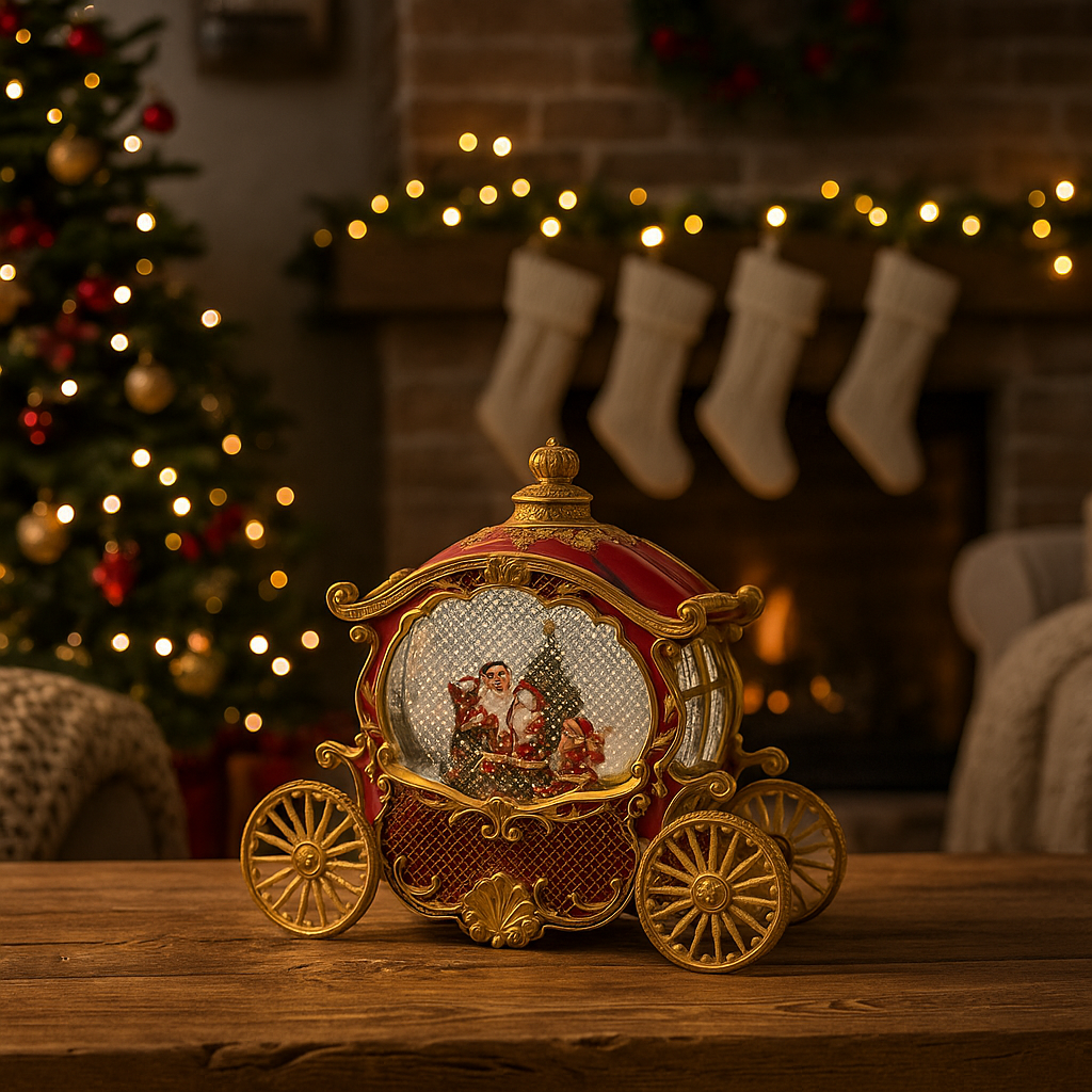 Un minuscolo palcoscenico invernale prende vita in questa carrozza fiabesca: luci soffuse illuminano il cocchio, le ruote girano lentamente mentre una dolce melodia natalizia riempie l’aria, trasformando qualunque angolo in un piccolo spettacolo di luci e suoni. Alta 23 cm, occupa poco spazio ma cattura subito l’attenzione grazie ai dettagli dipinti a mano e agli effetti dinamici che rendono la scena incredibilmente realistica. Basta attivare il meccanismo per ritrovarsi immersi in un’atmosfera da fiaba, perfetta per affiancare il villaggio natalizio, arricchire la base dell’albero o fare da centro di un tavolo festivo.