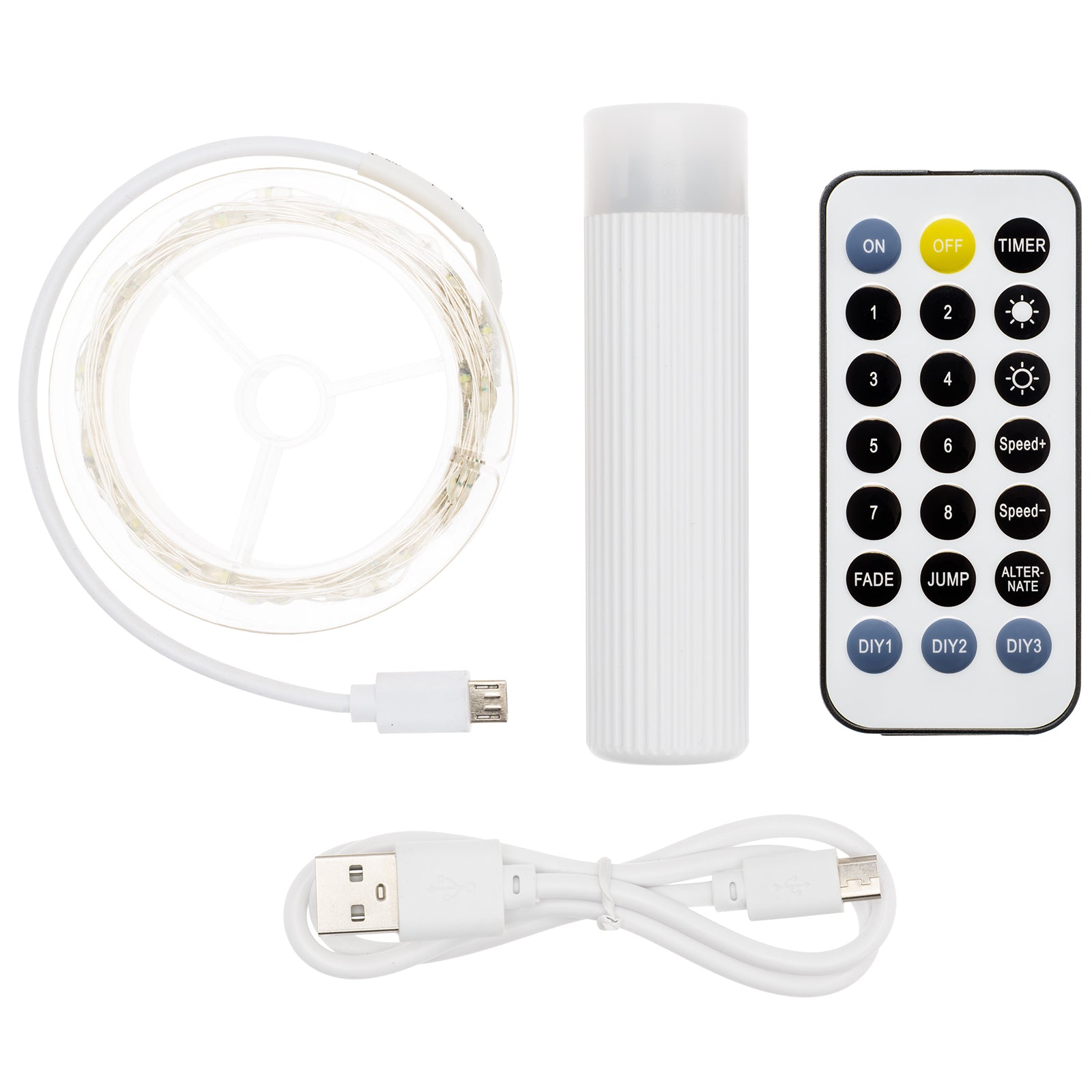 Ha un telecomando con 21 funzioni: tra queste l'ON/OFF, la variazione di luminosità, il timer 6/18 ore e 8 giochi di luce da variare a piacimento. Il telecomando ad infrarossi si può utilizzare in un raggio di 4 metri.