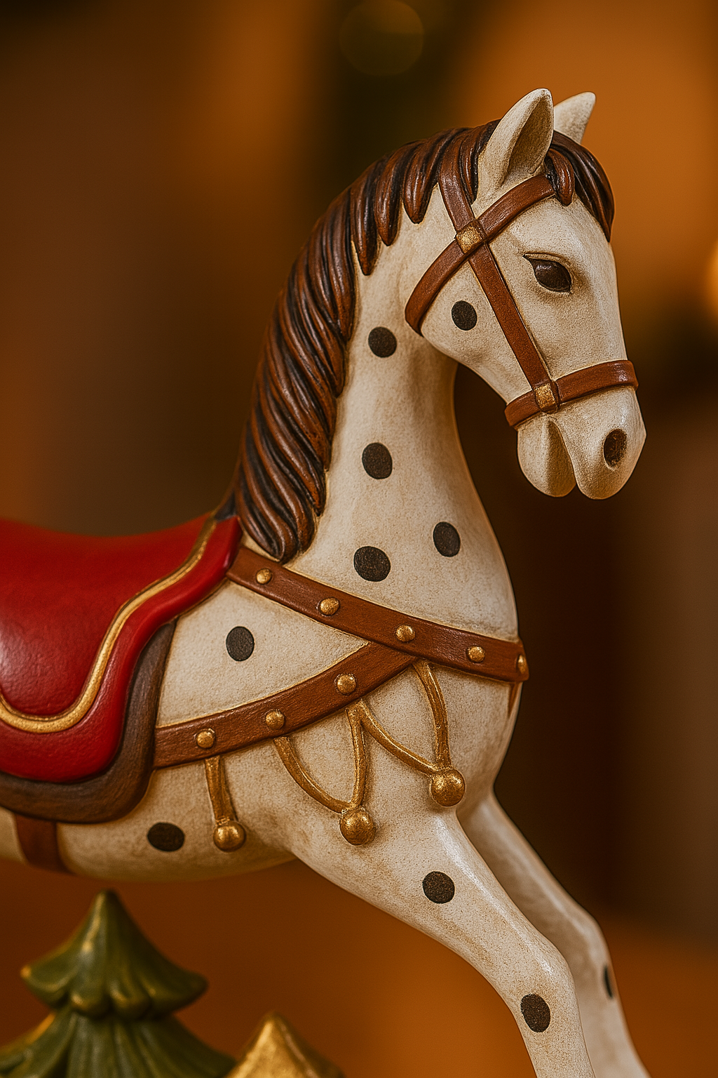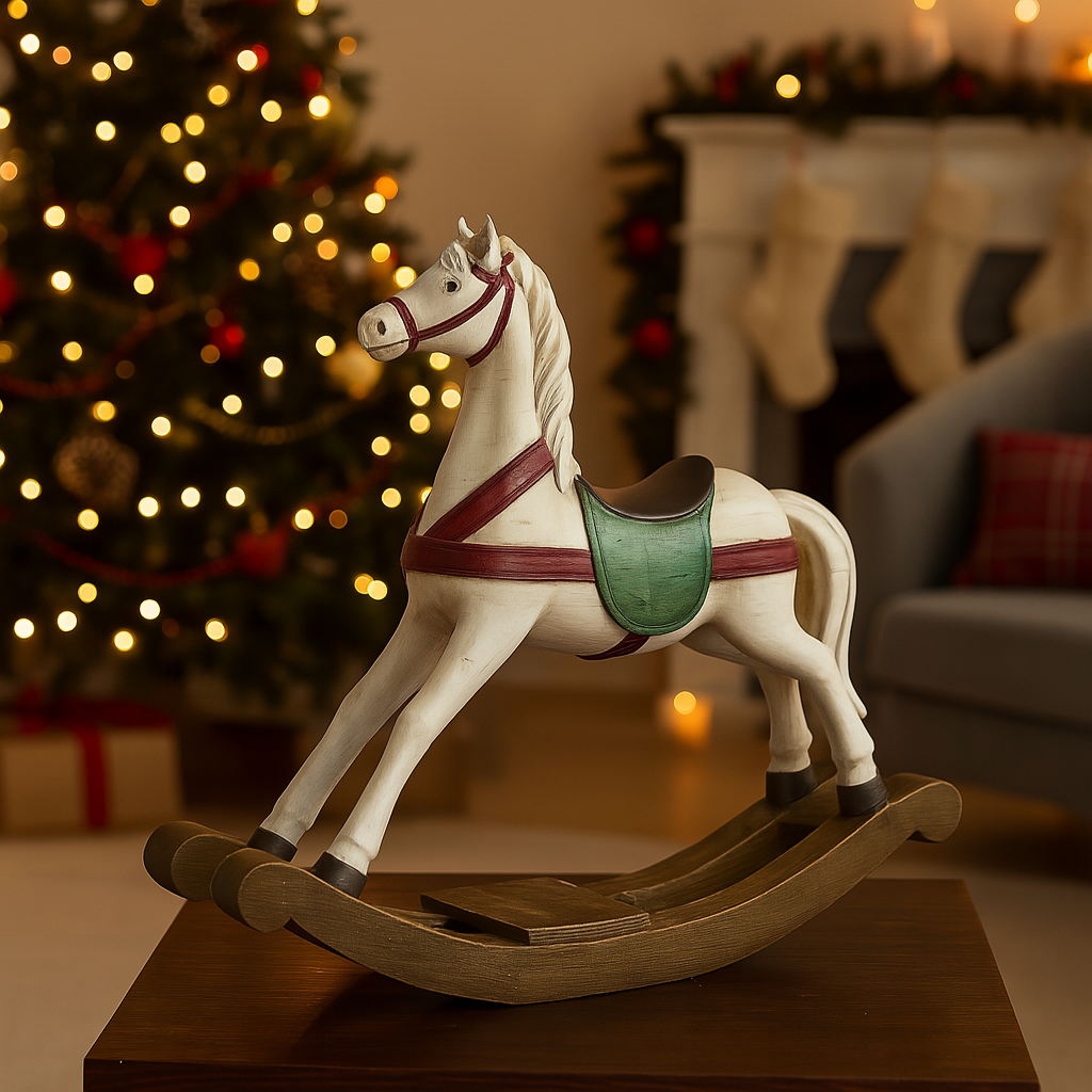 Questo cavallo a dondolo bianco è una decorazione natalizia dallo stile delicato ed elegante, perfetta per evocare la magia dei giochi d’infanzia e l’atmosfera calda delle feste.
