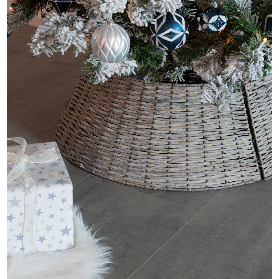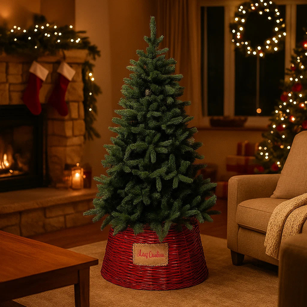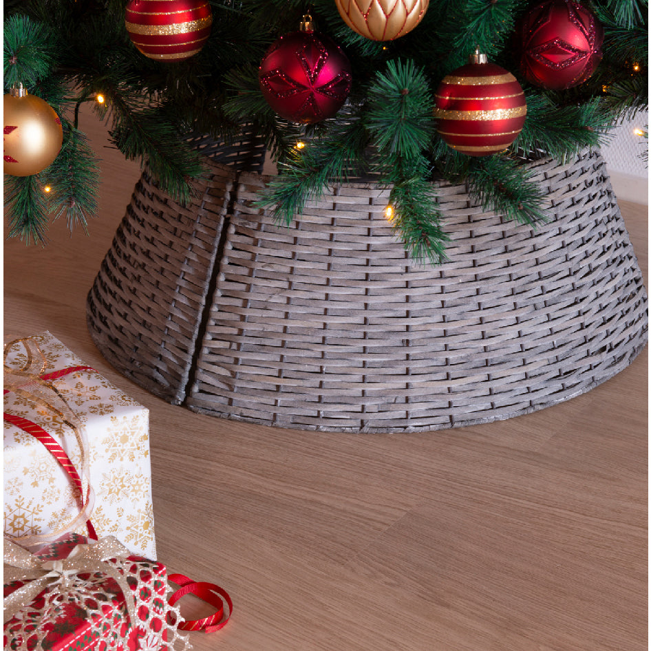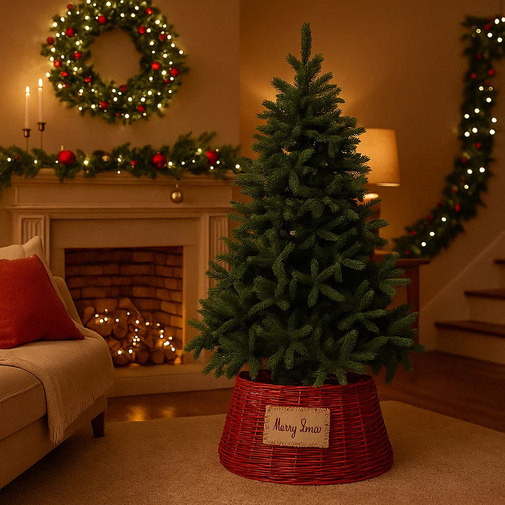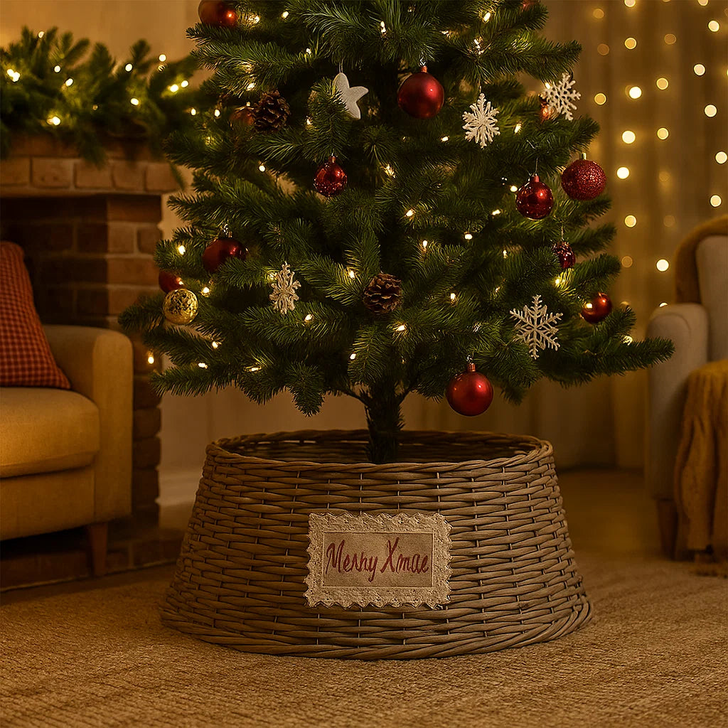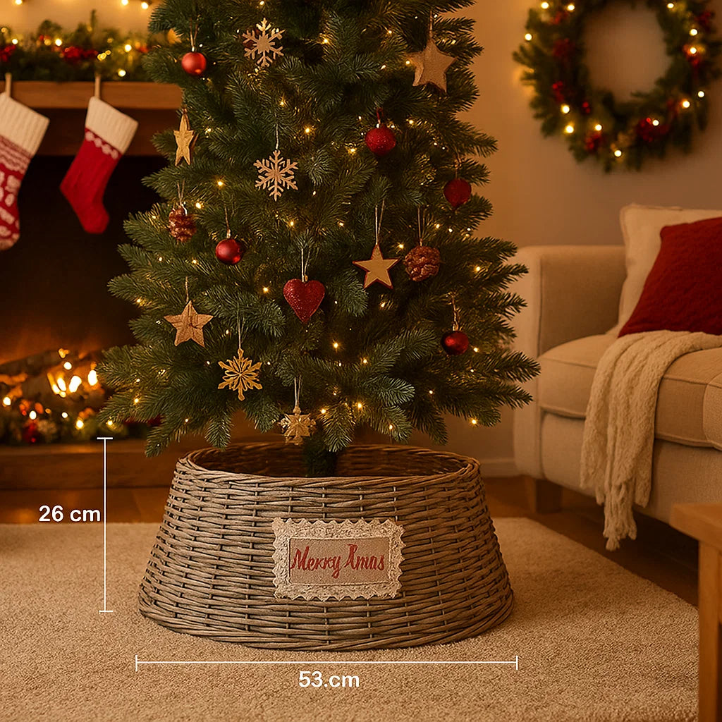 La cesta copri base per albero di Natale naturale è una decorazione natalizia pensata per nascondere elegantemente la base dell'albero, migliorandone l'estetica e creando un aspetto più ordinato.