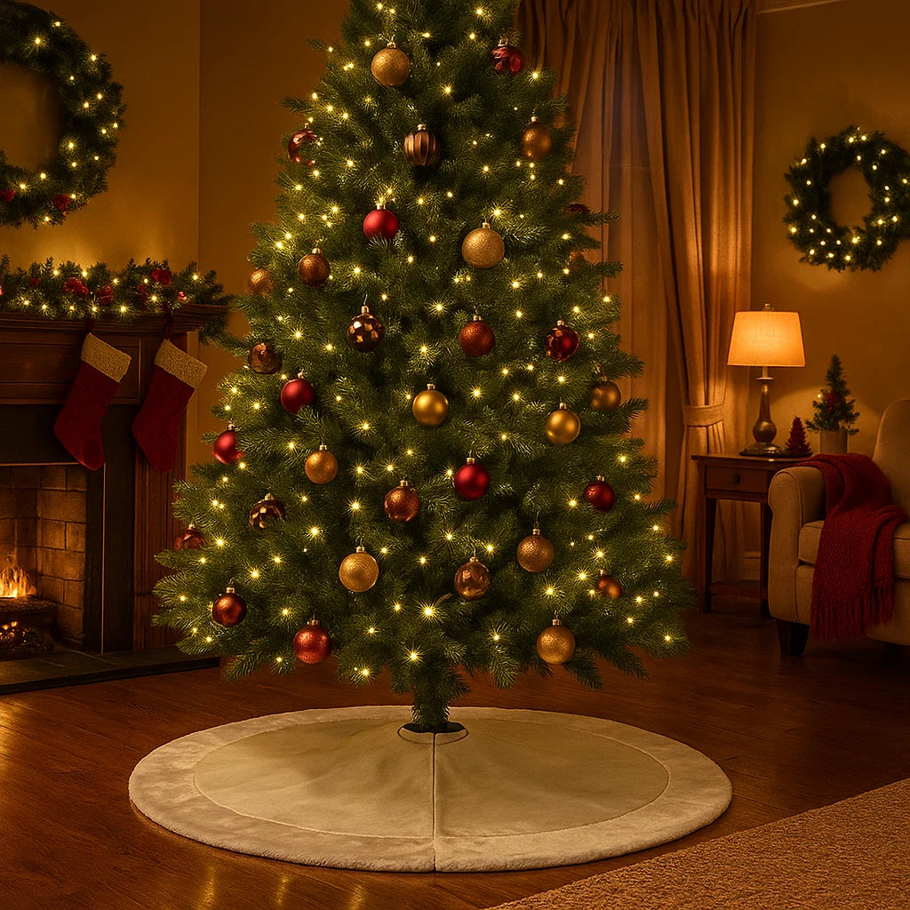 La morbidezza del velluto e il bordo in pelliccia creano un effetto scenografico capace di valorizzare qualsiasi tipo di albero, donando un tocco di calore e armonia all’ambiente.