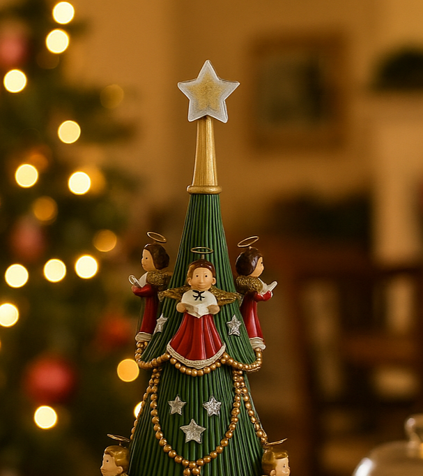 Questa splendida decorazione a forma di albero di Natale è pensata per portare un’atmosfera calda e incantata nella tua casa. Impreziosita da delicati angeli che sembrano danzare tra i rami e da un raffinato sistema di illuminazione a LED, è perfetta per arricchire il tuo soggiorno, l’ingresso o qualunque ambiente desideri rendere speciale durante le feste.