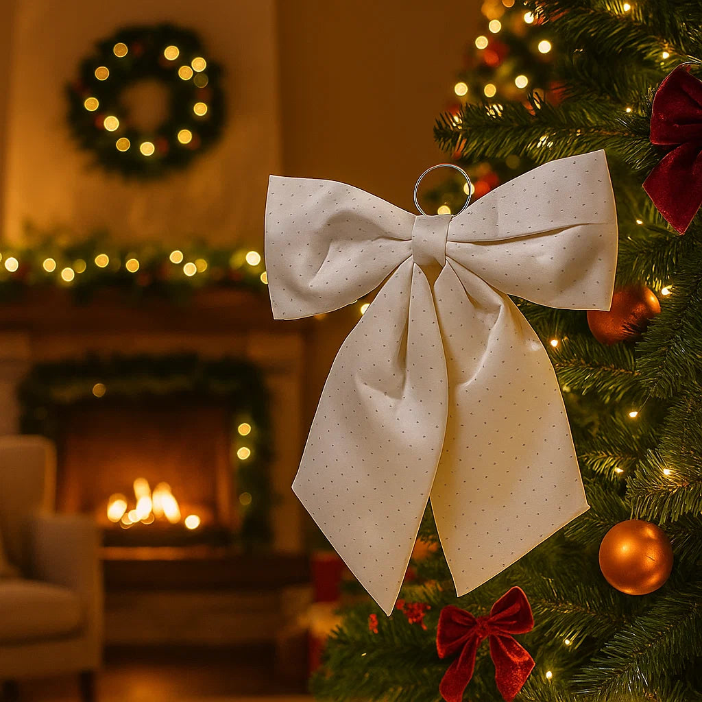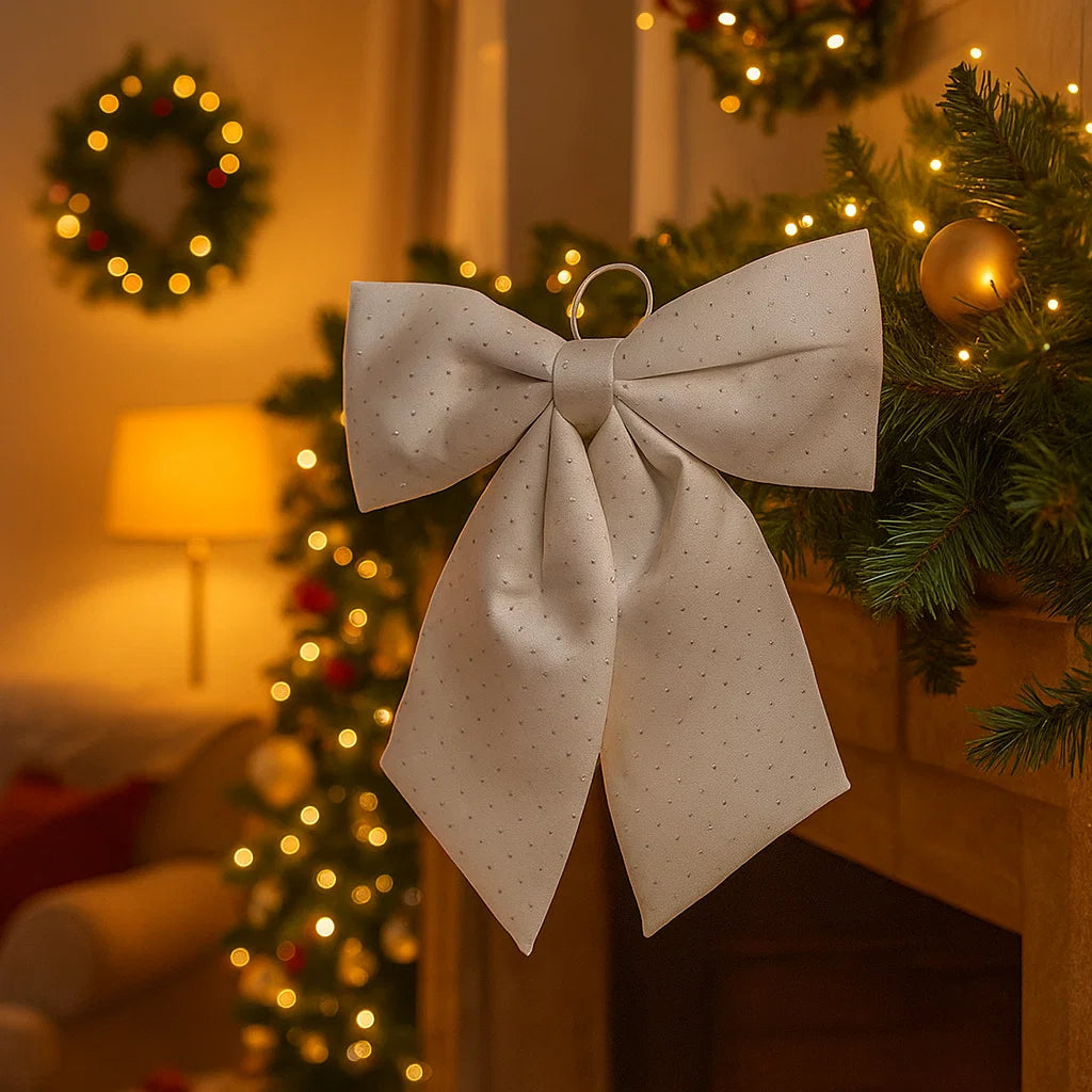 Il fiocco in tessuto color argento con diamanti è una decorazione natalizia di grande impatto estetico, progettata per aggiungere un tocco di eleganza e sofisticazione agli ambienti durante le festività.