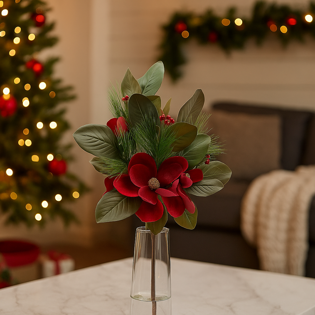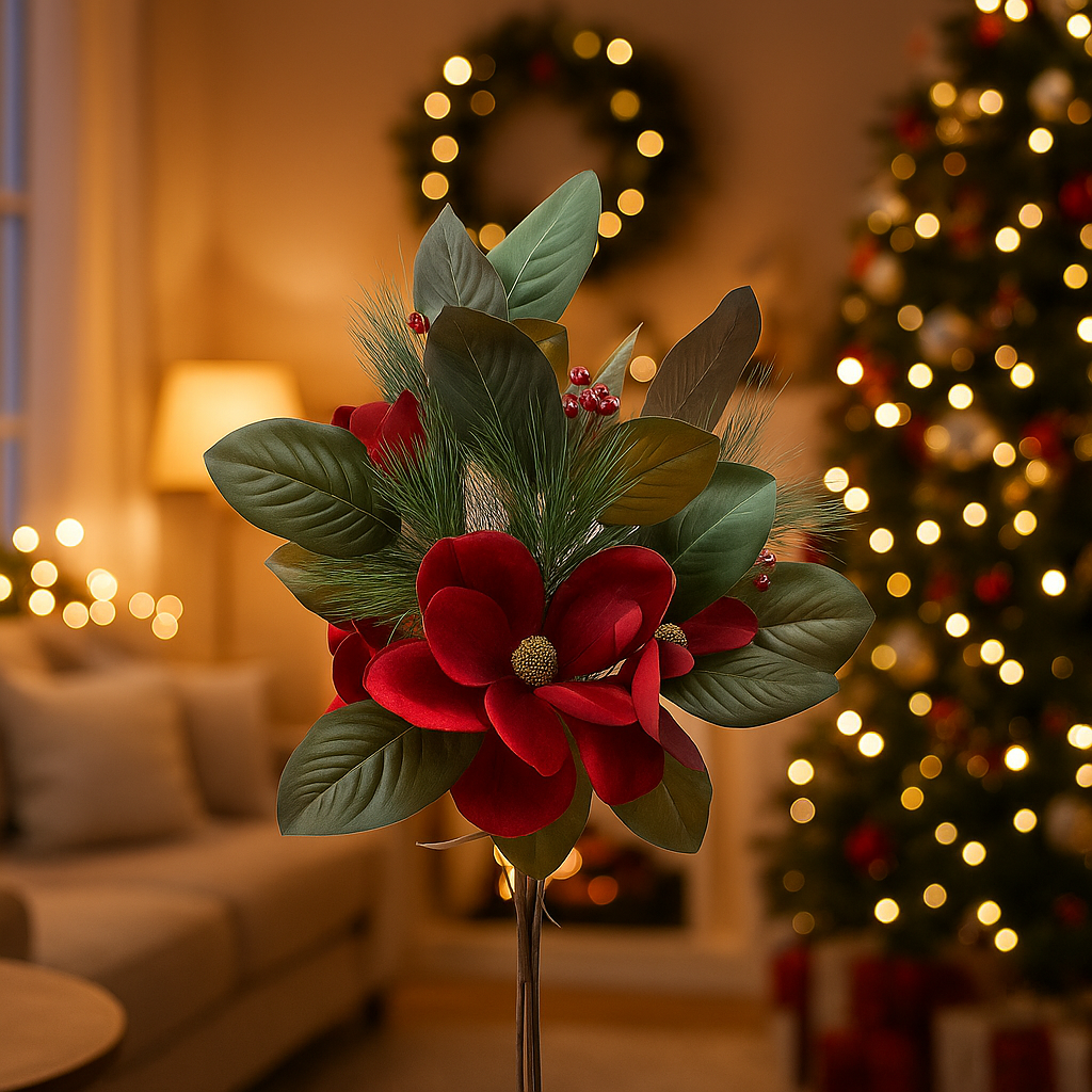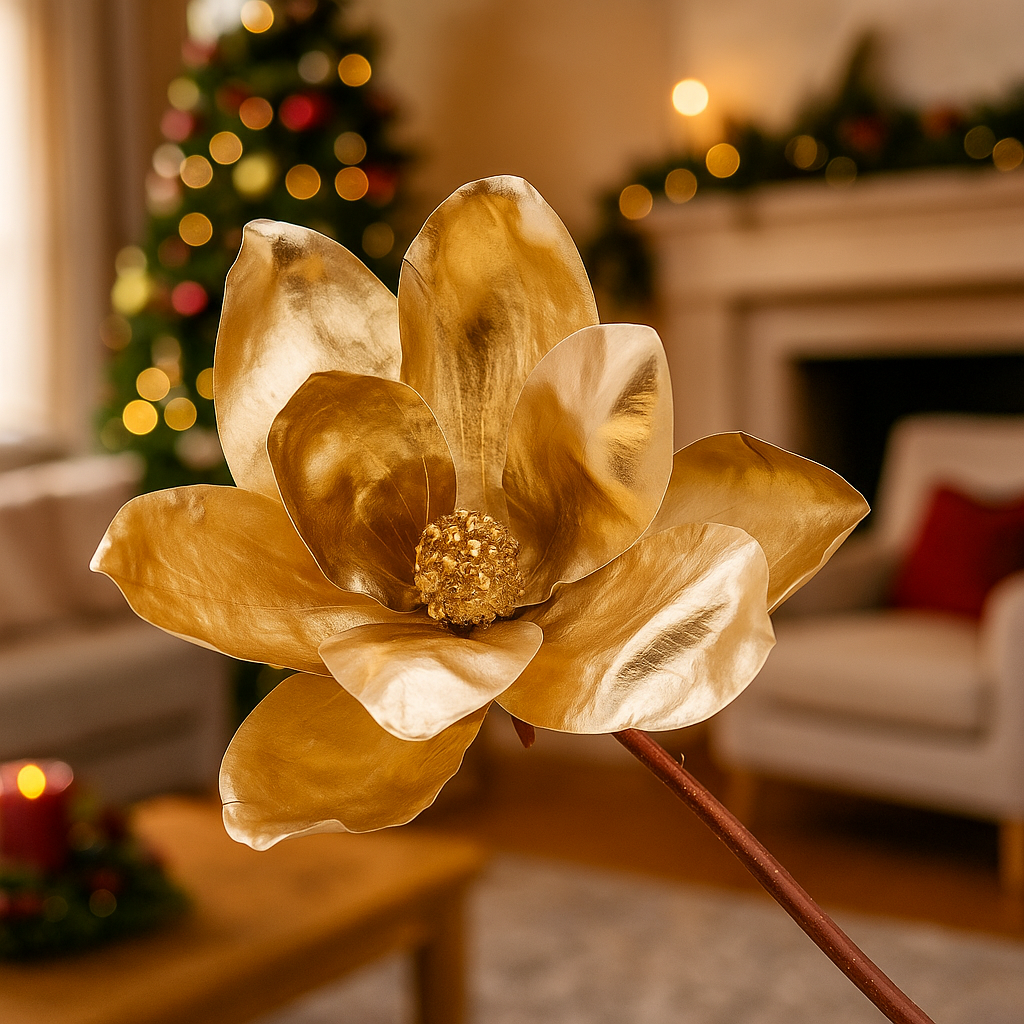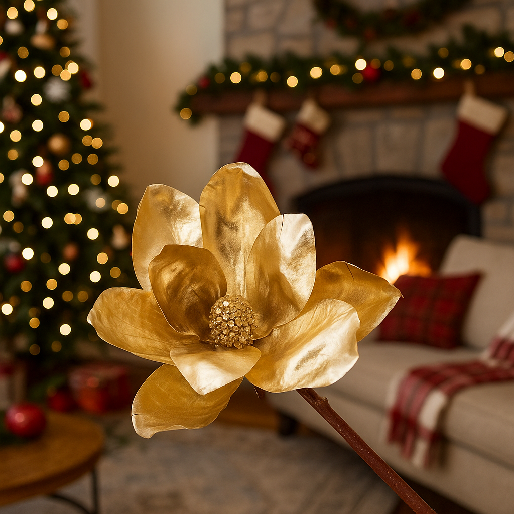Questo raffinato fiore di magnolia è la decorazione perfetta per portare un tocco elegante e ricco di atmosfera natalizia nei tuoi ambienti.