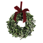 Ghirlanda "Iside" verde con fiocco rosso in foglie di bosso e rami di pino dal diametro di 30 cm