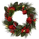 Ghirlanda natalizia di lamponi, con bacche rosse e pigne decorative per dietro porta