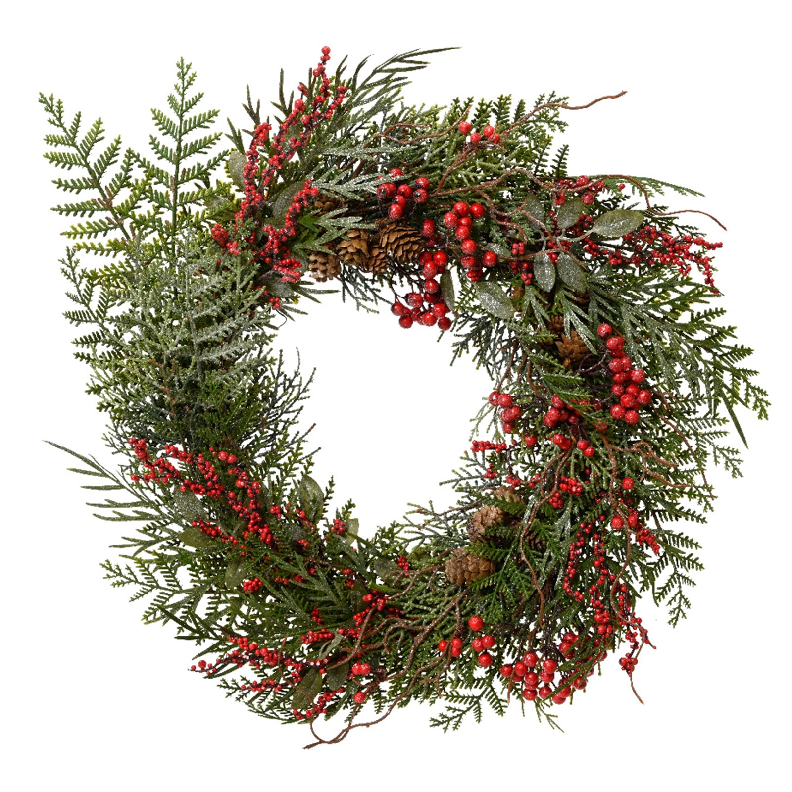 Ghirlanda tonda natalizia con bacche rosse dietro porta 50 cm