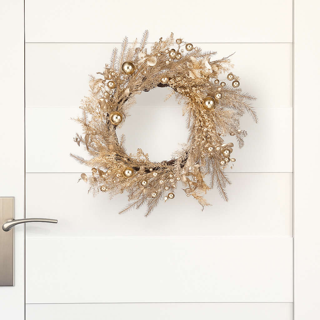 Rendi magico l’ingresso della tua casa con questa splendida ghirlanda tonda natalizia! Decorata con foglie e bacche in tonalità oro, dona subito un tocco elegante e luminoso, perfetto per chi ama uno stile raffinato e festivo.