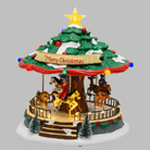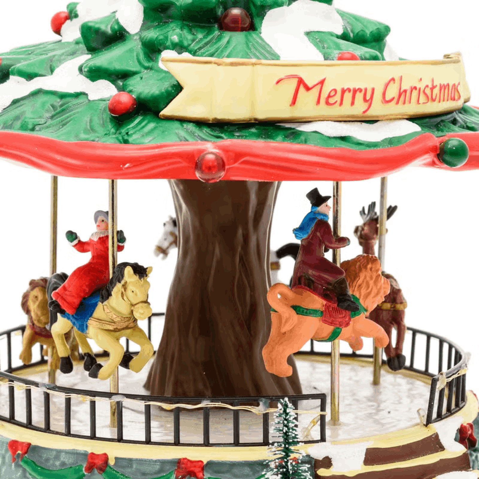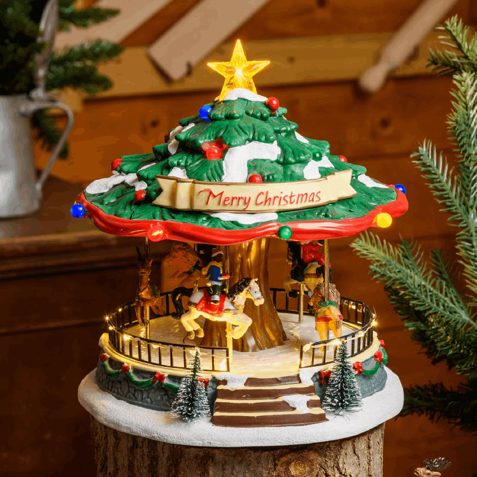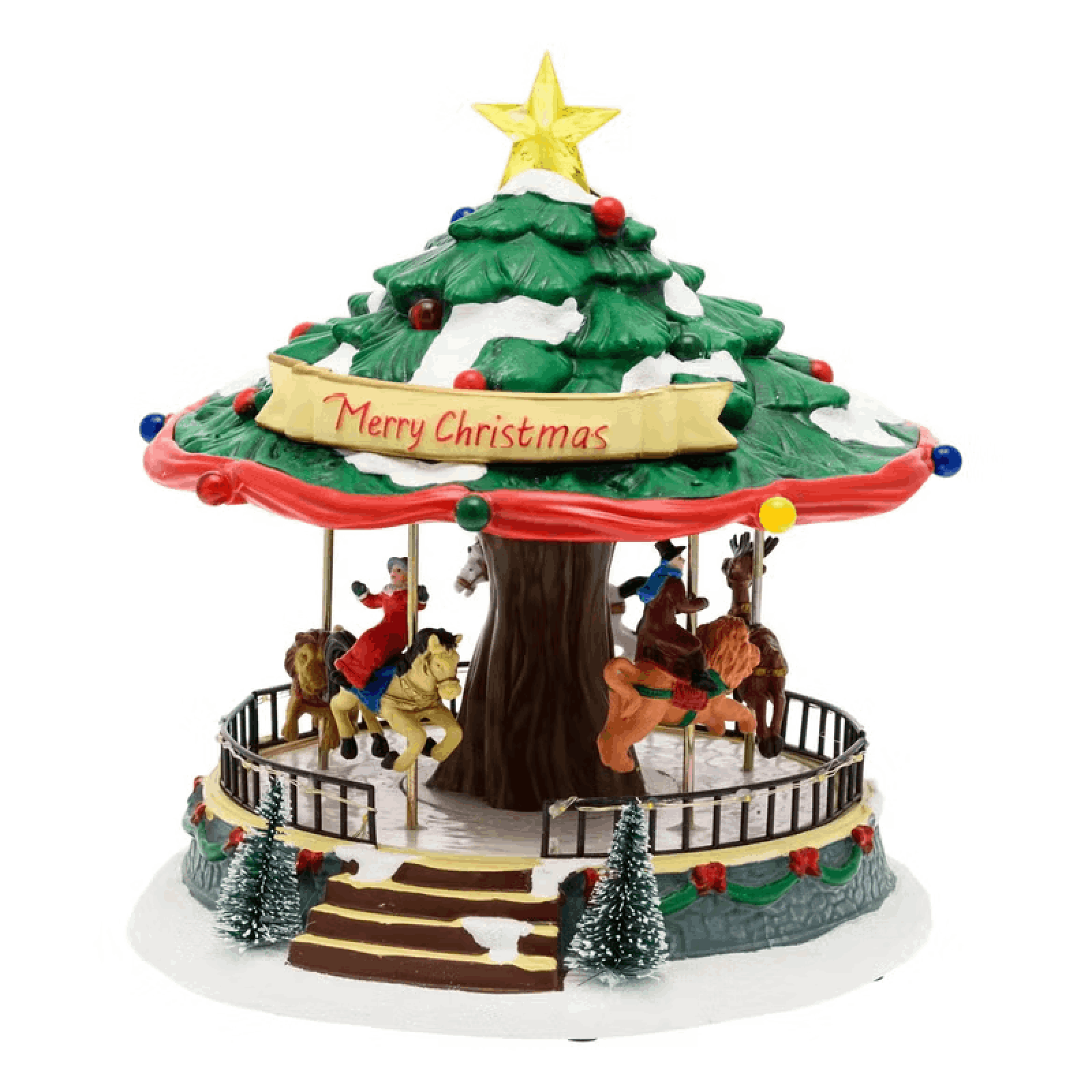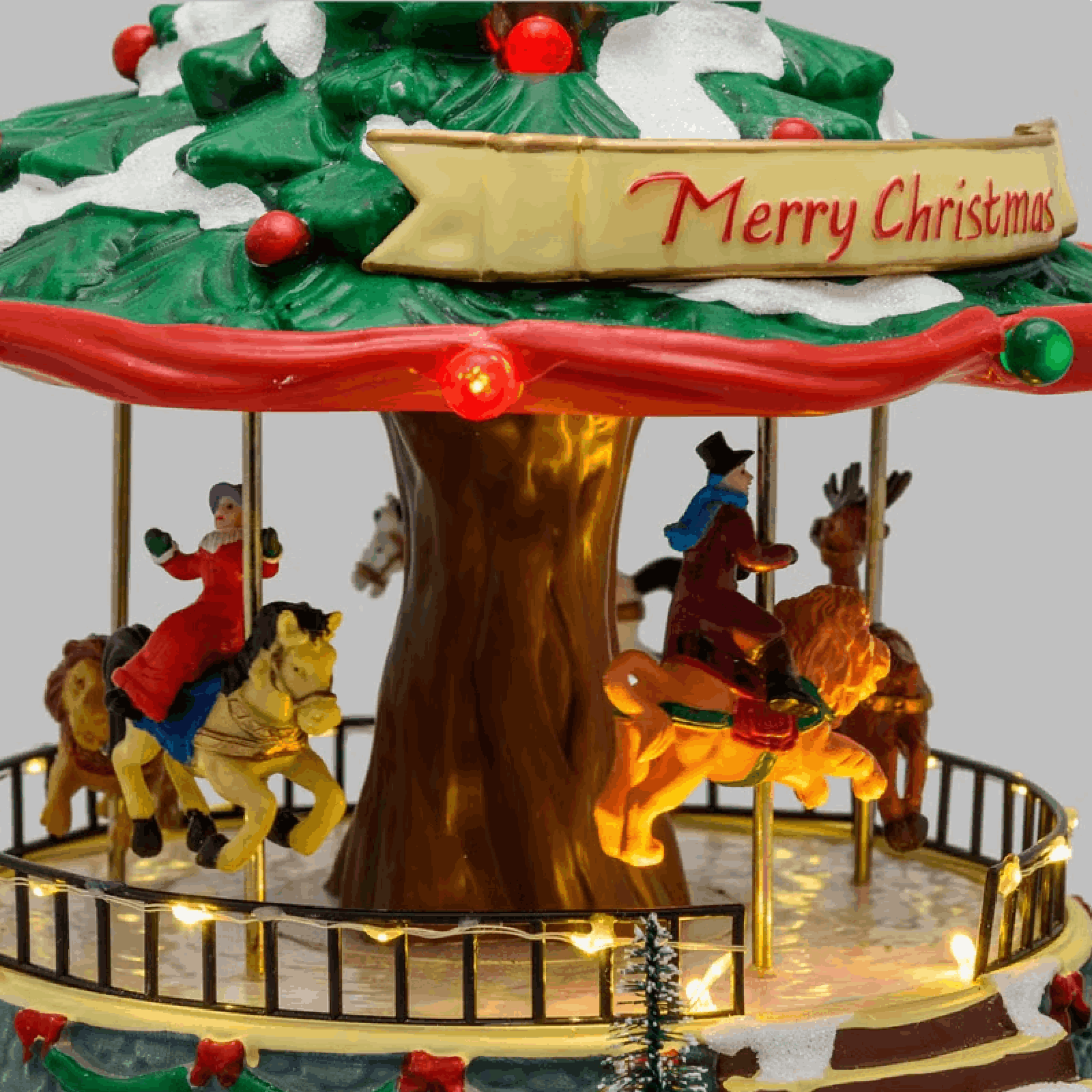 Villaggio di Natale raffigurante una giostra natalizia con cavalli in movimento rotatorio e giochi di luce colorata.