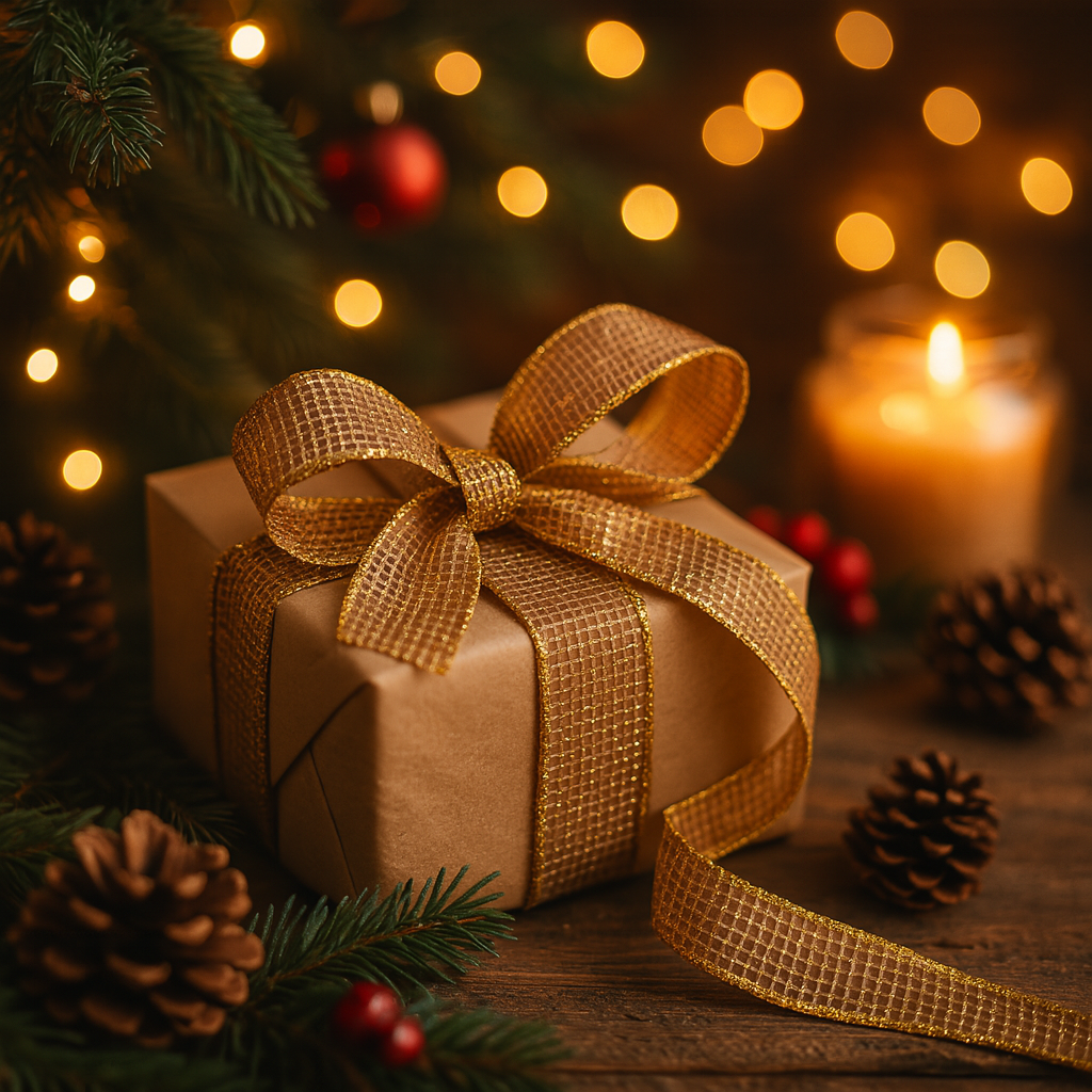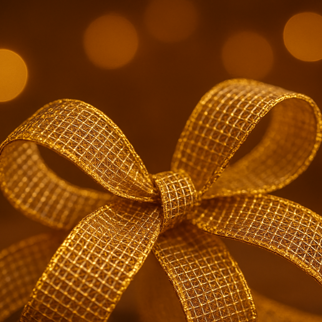 Porta calore e raffinatezza alle tue decorazioni natalizie con questo elegante nastro marrone e oro.