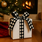Dai un tocco di stile moderno e sofisticato alle tue decorazioni natalizie con questo nastro nero arricchito da un motivo di piccoli quadratini bianchi.