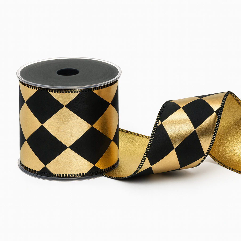 Porta un tocco di stile moderno e sofisticato alle tue decorazioni natalizie con questo elegante nastro quadrettato nei toni nero e dorato.