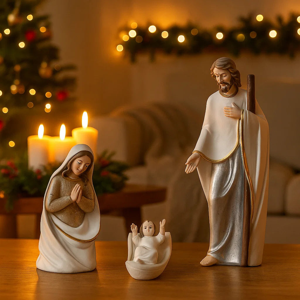 Regala eleganza e spiritualità alle tue feste con la Natività stilizzata in poliresina bianco e argento.