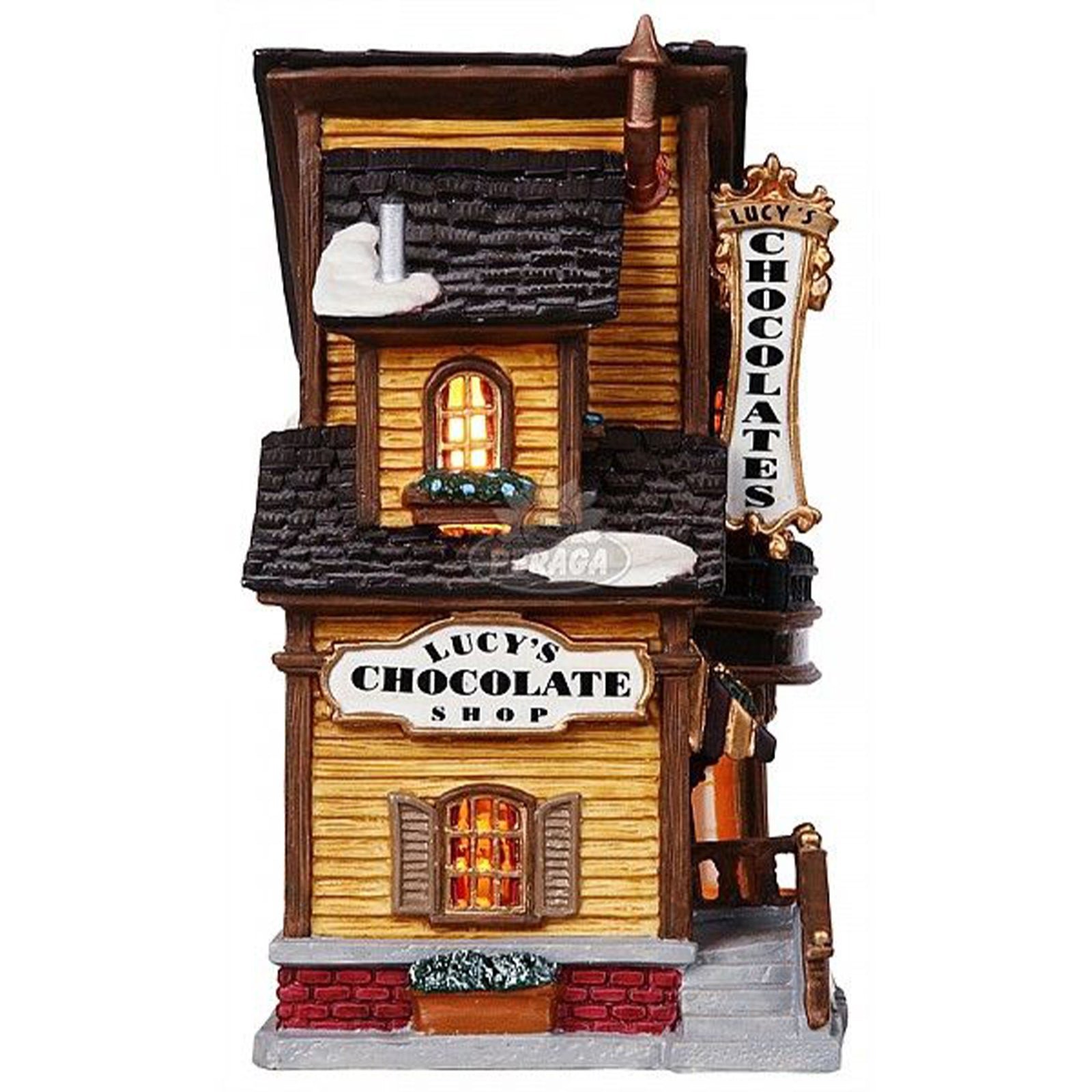 Negozio di cioccolata di Lucy statuetta natalizia per villaggio di Natale con luci