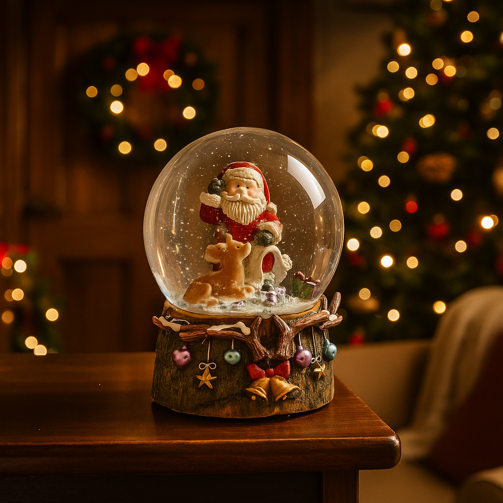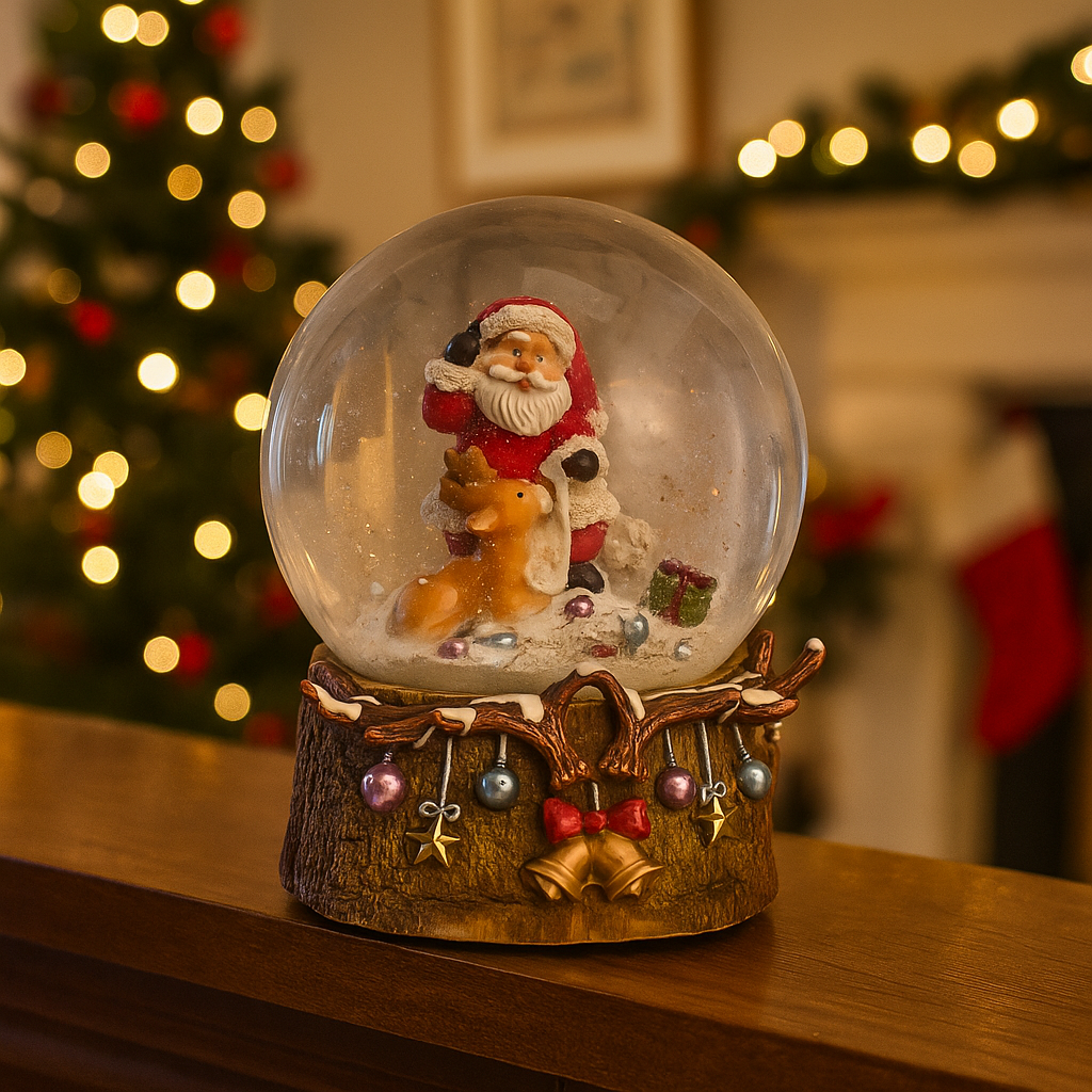 All'interno della palla di vetro è presente un delizioso Paesaggio natalizio con l'immagine di Babbo Natale circondato da vari addobbi, come stelle, campane, fiocchi di neve e renne.