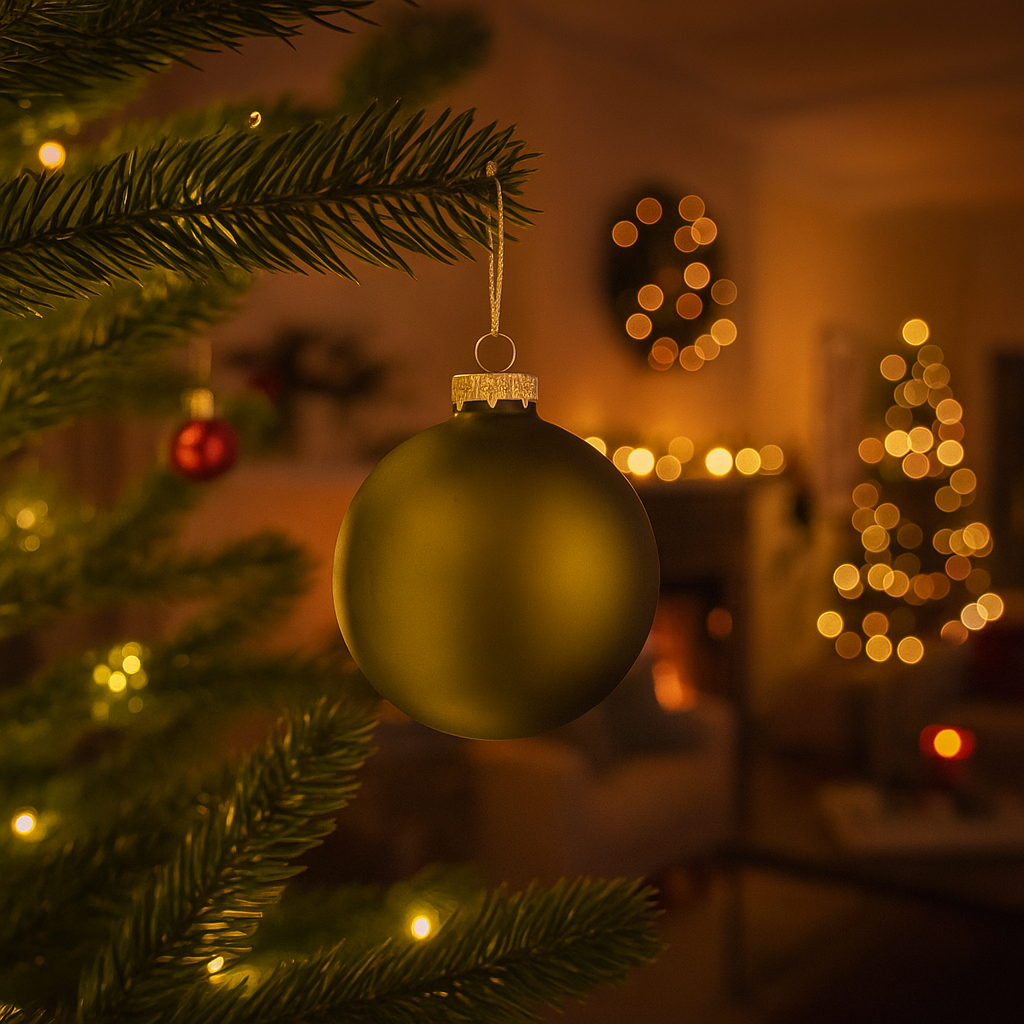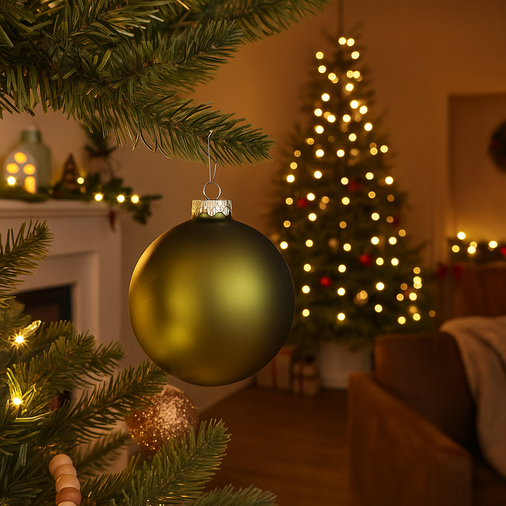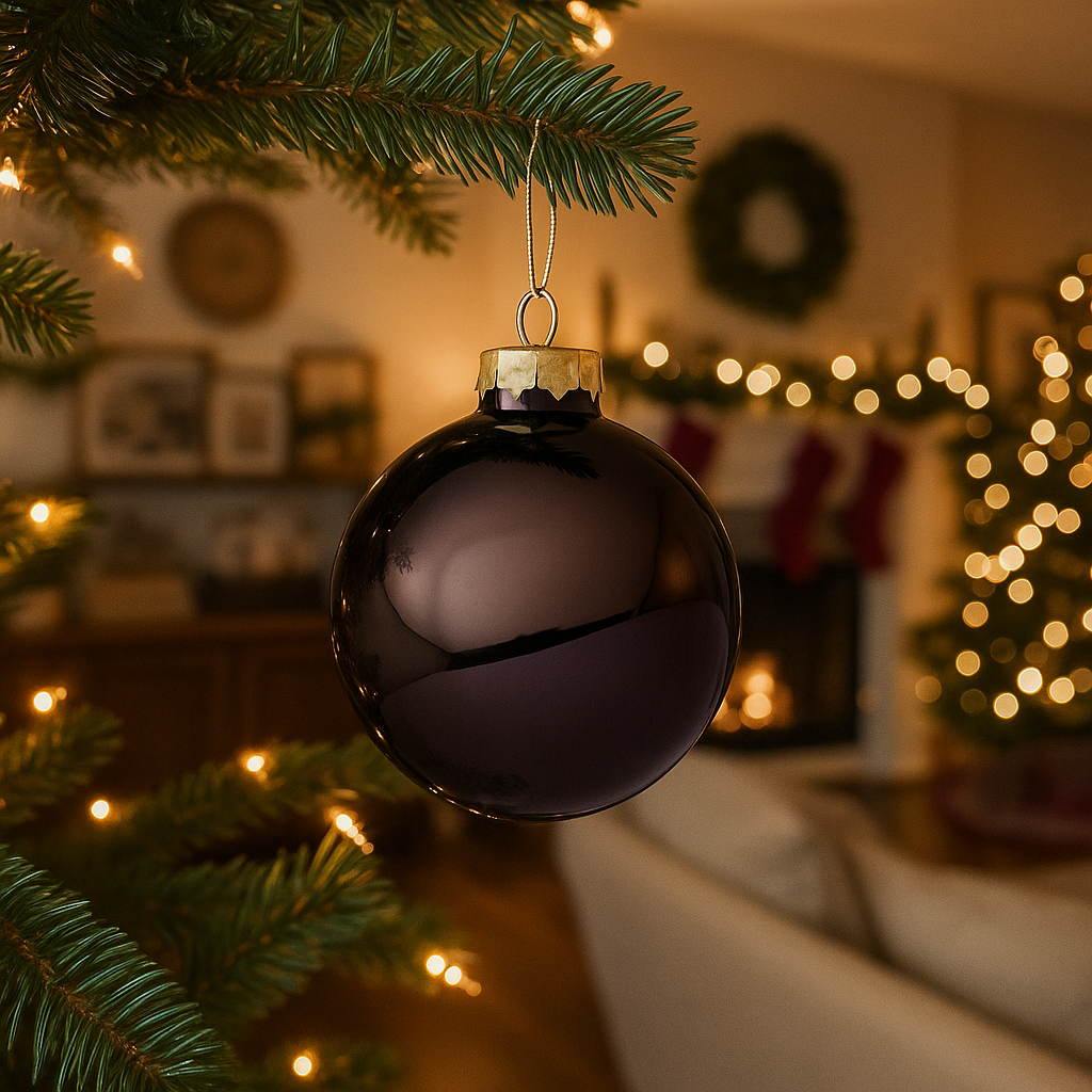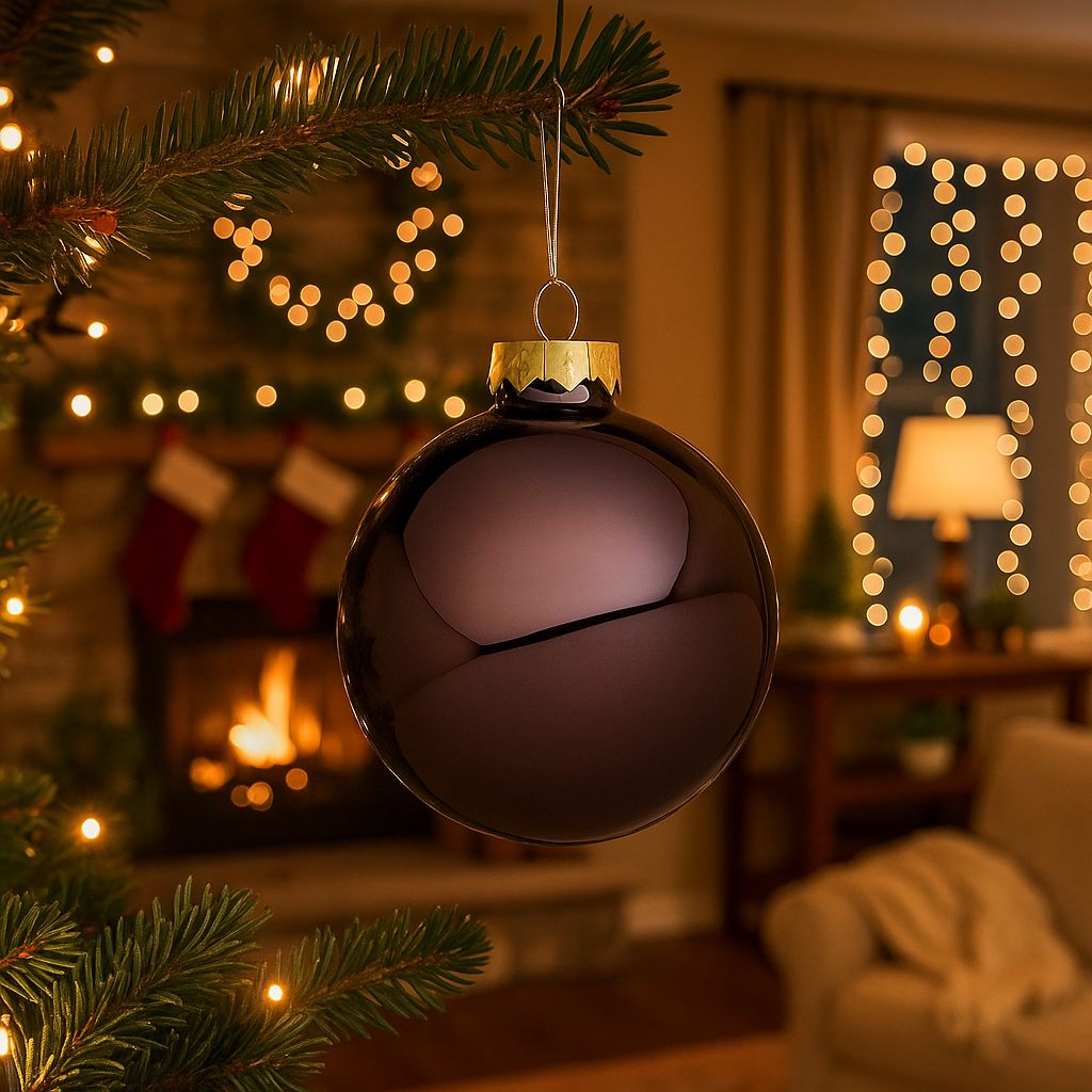 Finitura lucida che esalta i riflessi delle luci dell’albero o delle candele, creando un effetto scenografico e ricco di atmosfera
