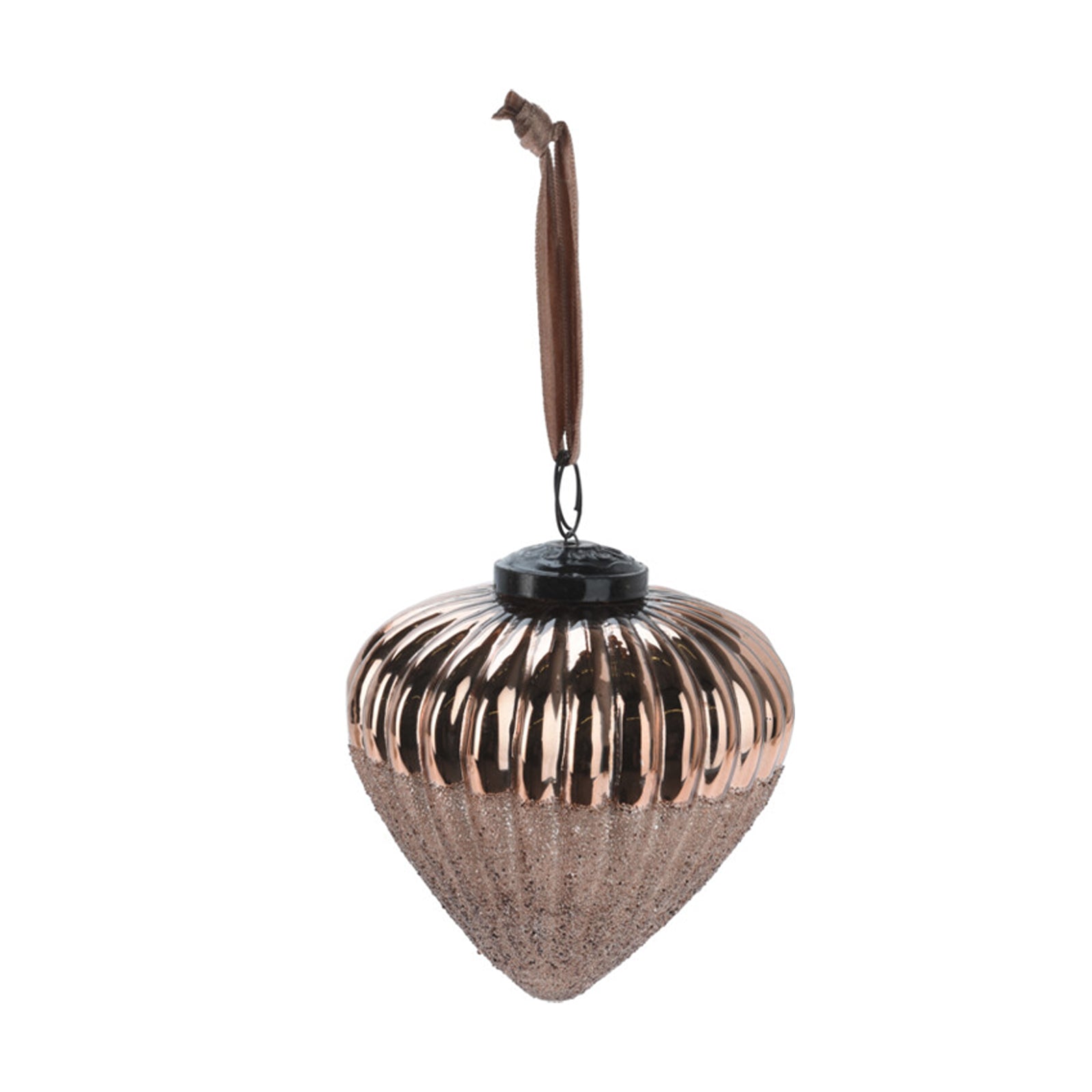 Realizzata interamente in vetro, questa pallina si caratterizza per la sua forma a goccia che offre una variazione estetica rispetto alle classiche palline rotonde, creando un effetto visivo più dinamico e interessante sull'albero di Natale o in qualsiasi altro contesto decorativo.
