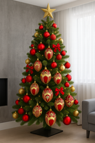 Il vetro rosso intenso crea un effetto caldo e avvolgente, mentre le decorazioni dorate, finemente lavorate, riflettono la luce con delicatezza, donando preziosi giochi di bagliori che valorizzano ogni ramo.