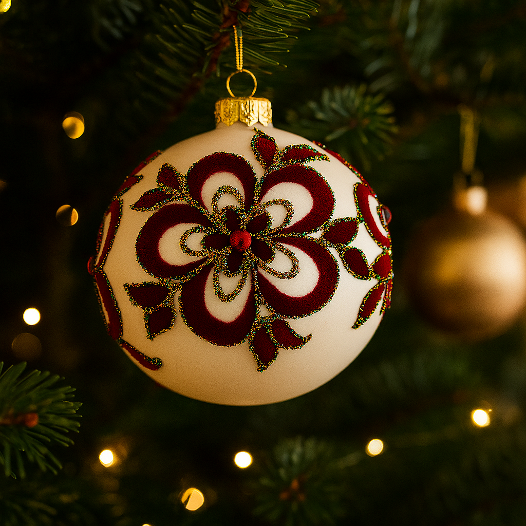 Aggiungi un tocco di classe e calore al tuo Natale con questa splendida pallina in vetro, arricchita da delicati motivi floreali in velluto bordeaux.