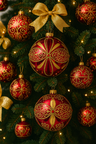 Il vetro rosso intenso crea un effetto scenografico e avvolgente, mentre le decorazioni dorate riflettono la luce con eleganza, regalando bagliori preziosi che impreziosiscono l’atmosfera delle feste.