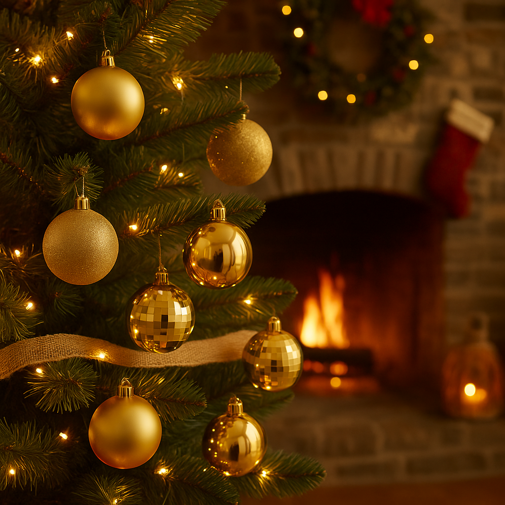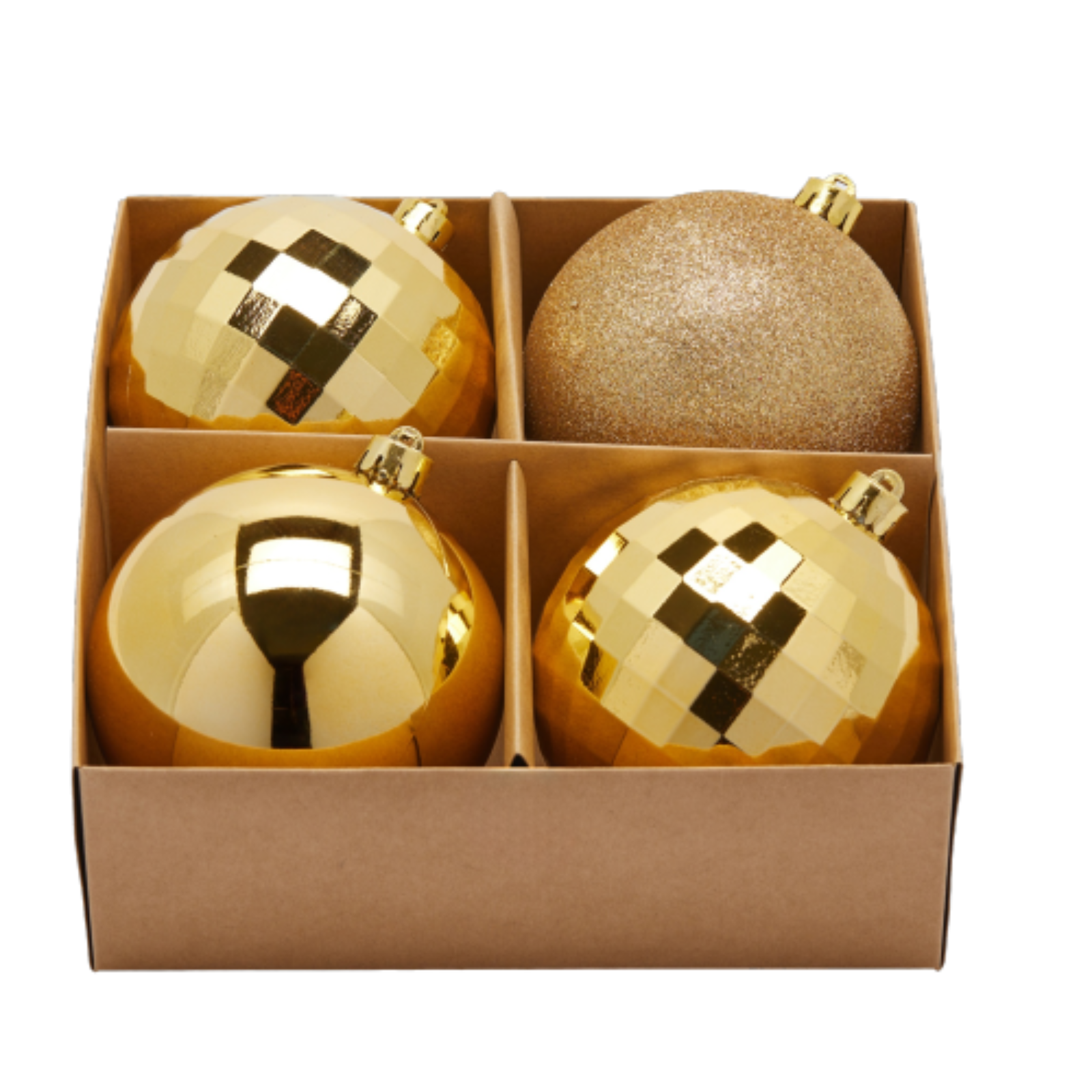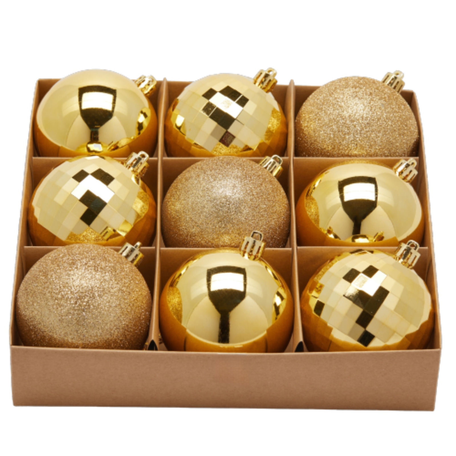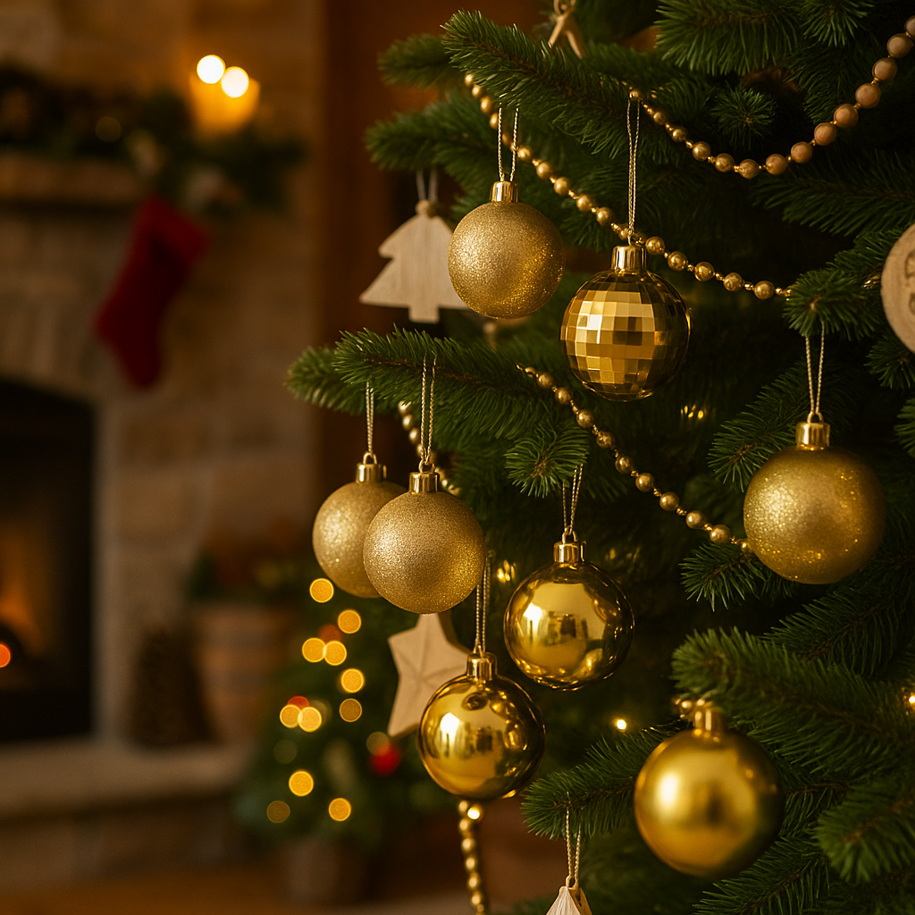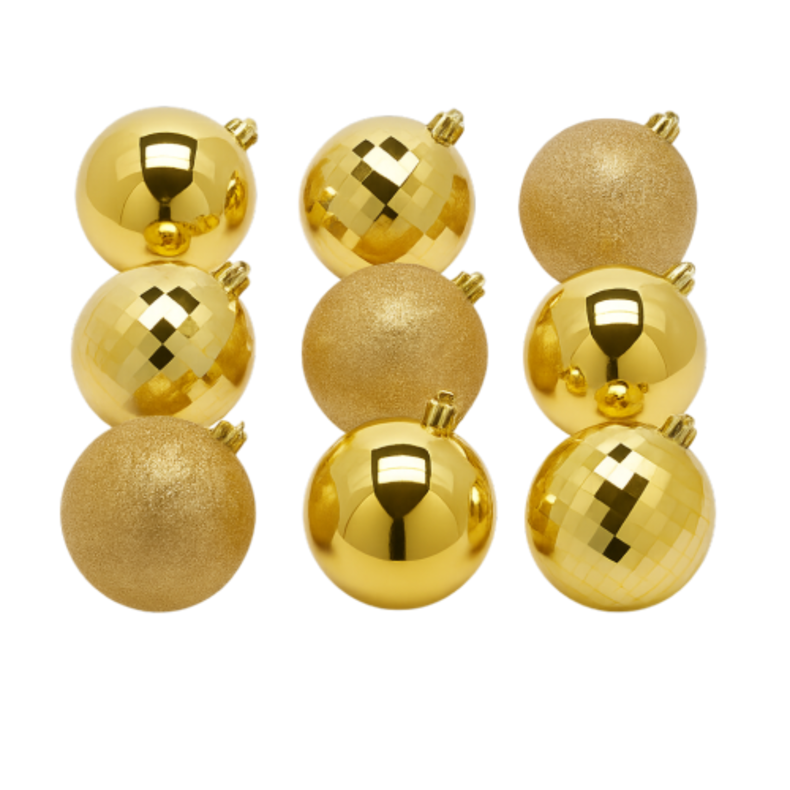 Un singolo colore oro specchiato, altamente brillante, che si abbina senza sforzo a palline satinate, fiocchi in velluto, rami naturali in legno, dettagli crema o persino contrasti in nero per un look luxury