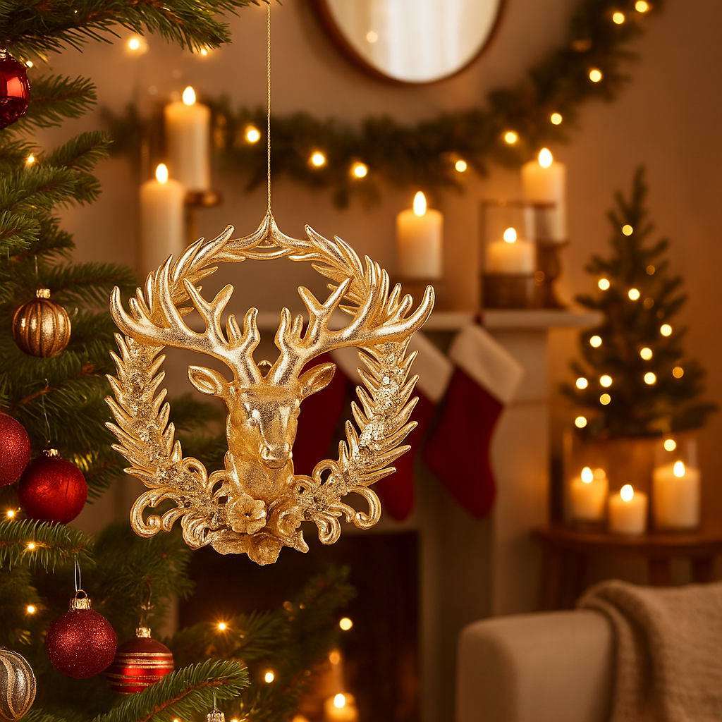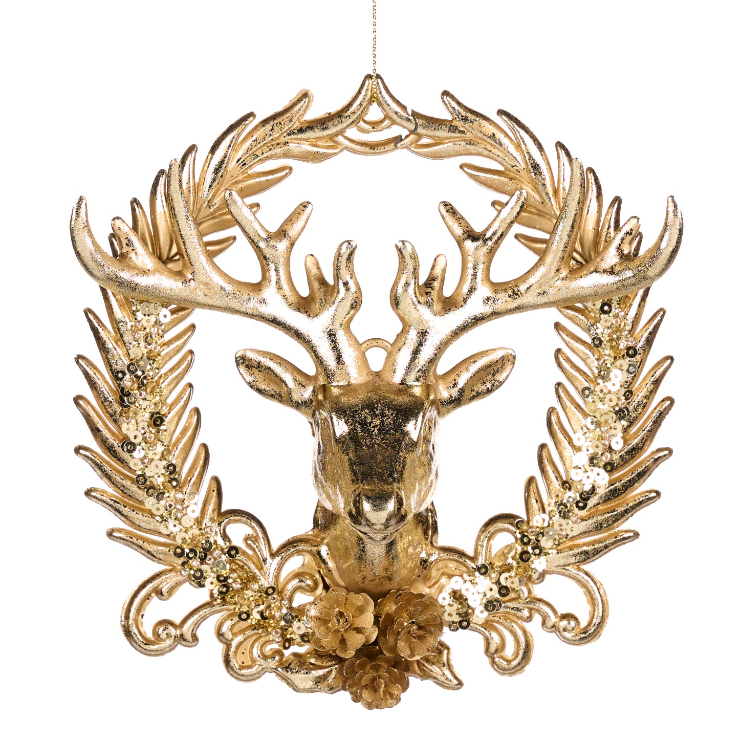 Pendaglio con testa di renna oro in plastica per albero di Natale da 15 cm