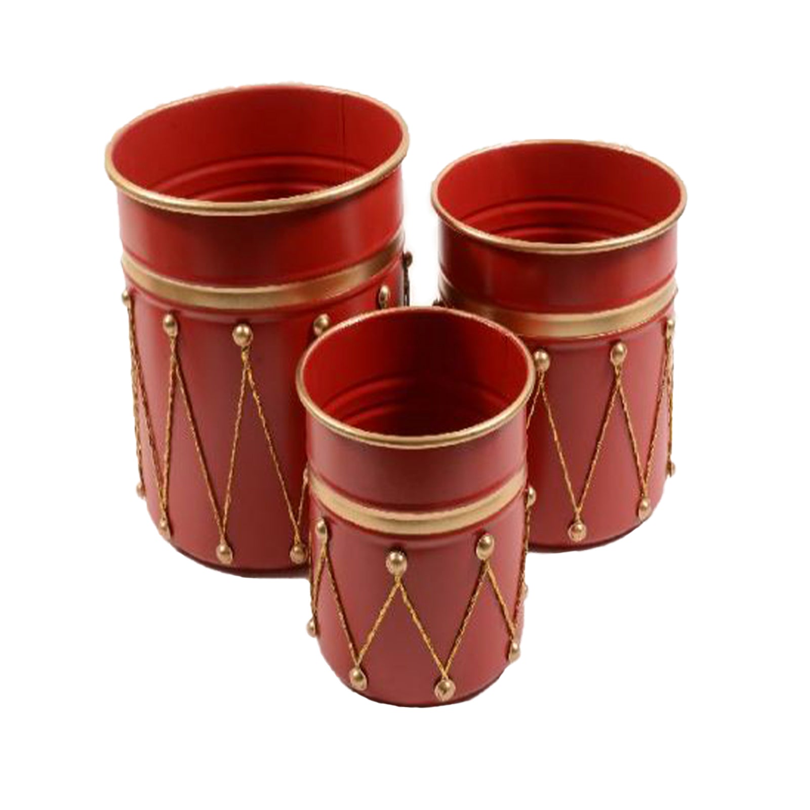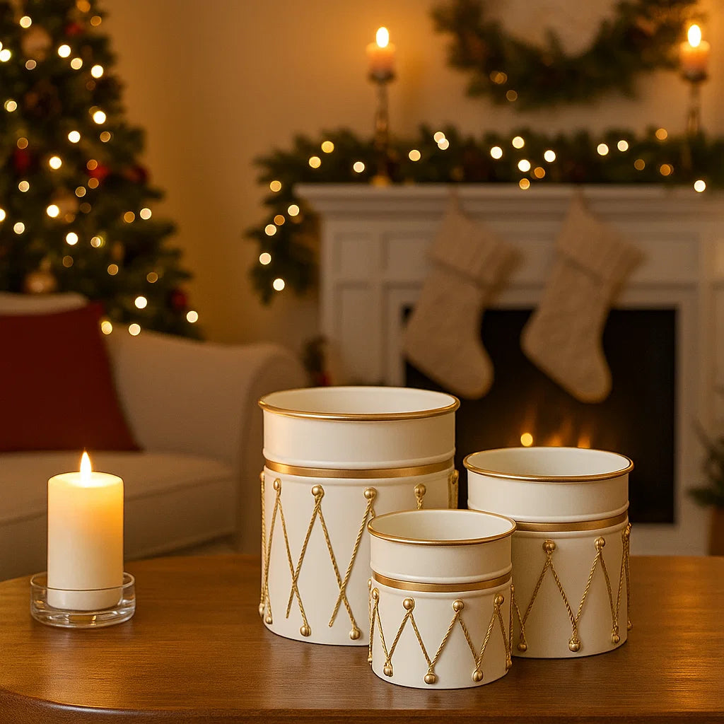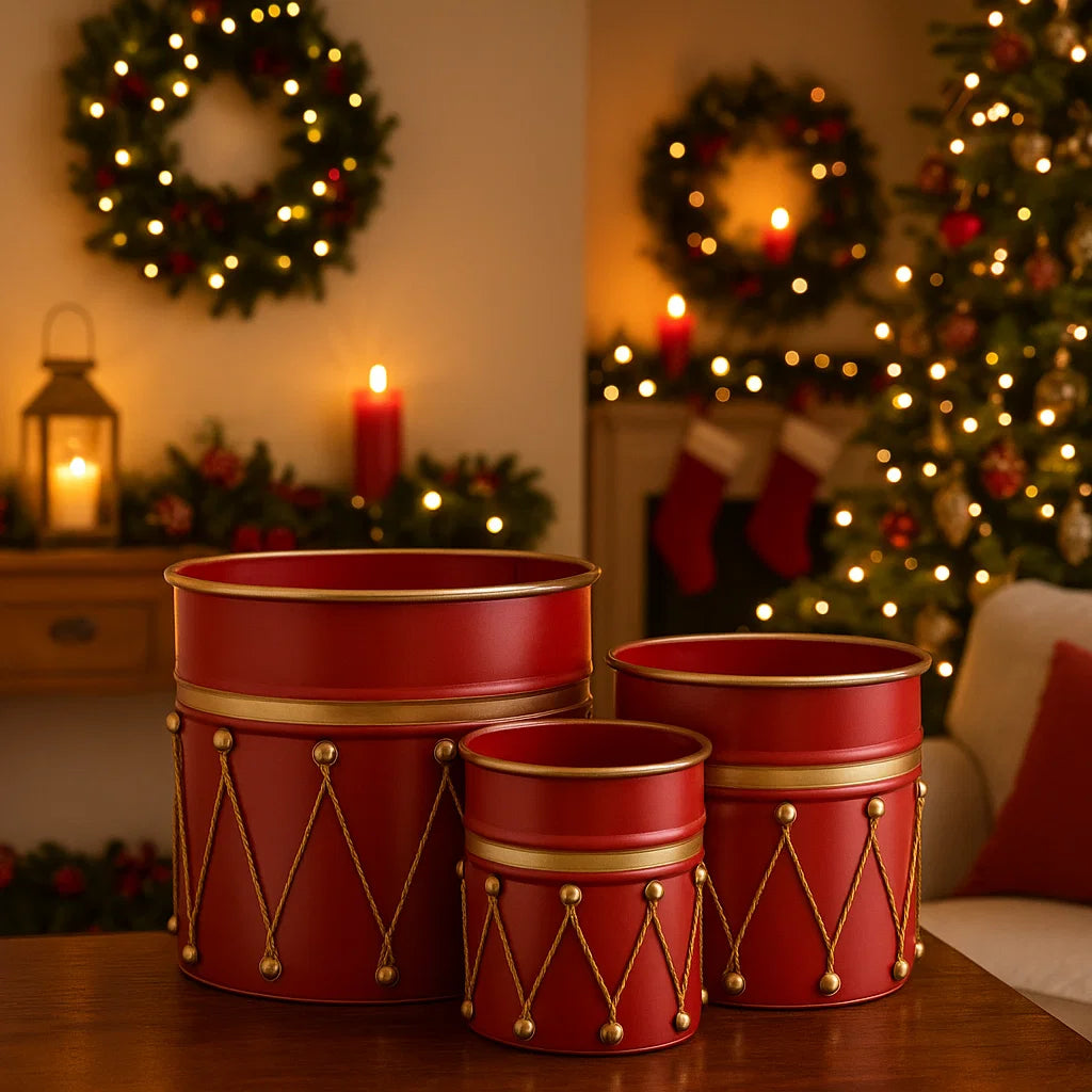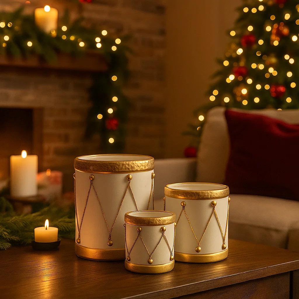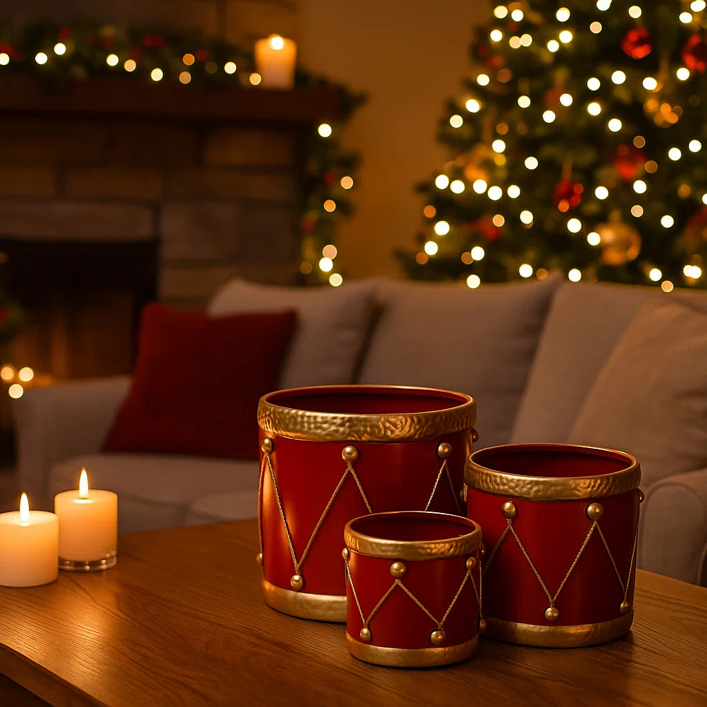 Il tamburo è decorato con dettagli dorati o argentati, che possono includere elementi come i cerchi e le corde del tamburo, rendendolo particolarmente festivo e in sintonia con il tema natalizio.